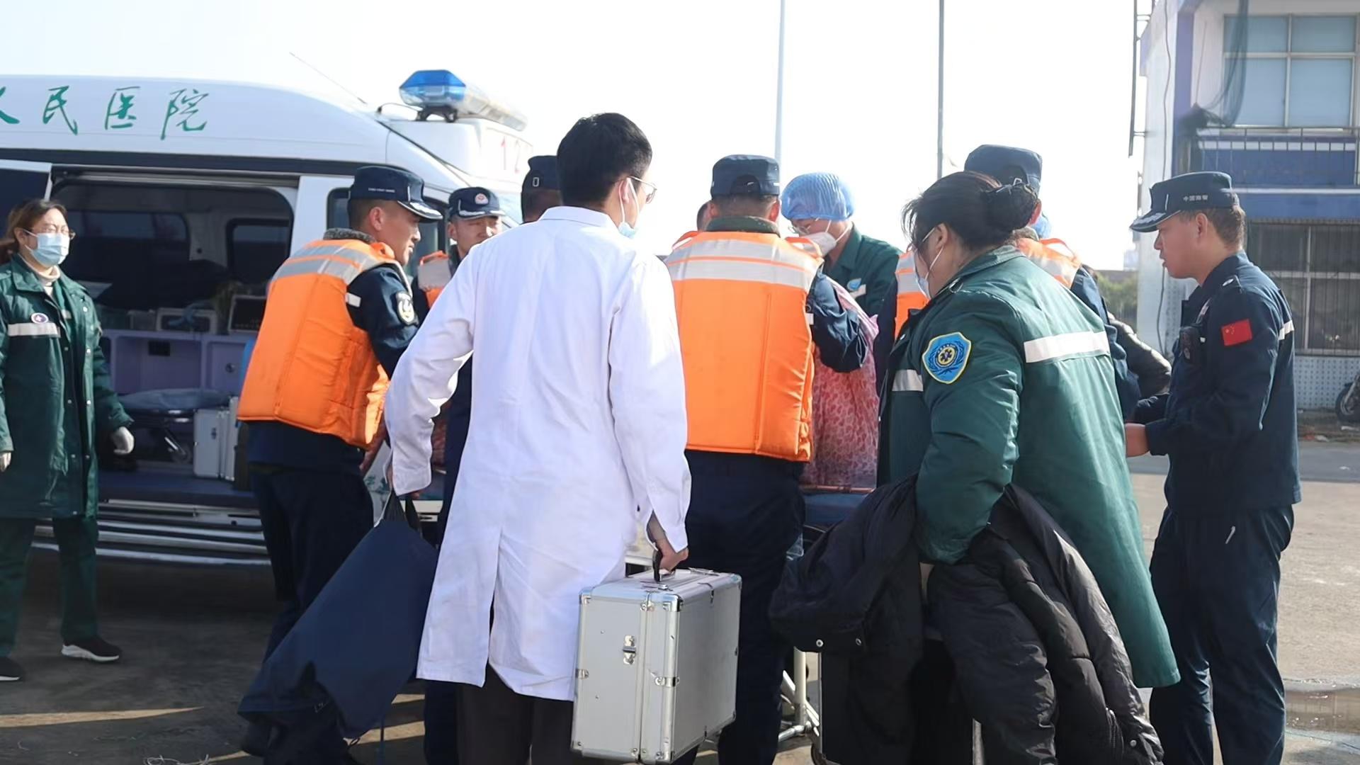 9時45分,白石艇靠泊榮成第二工作站碼頭。早已在此等候的當?shù)?20救護車將8名船員轉運至當?shù)蒯t(yī)院。經(jīng)過醫(yī)院全力救治,6人身體狀況穩(wěn)定,1人不幸失去生命體征,另1人仍在搶救中。