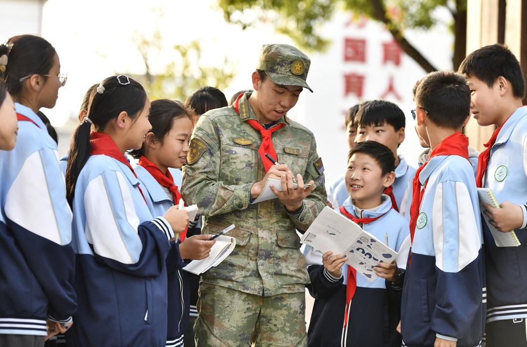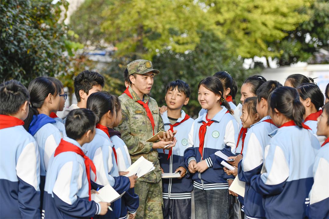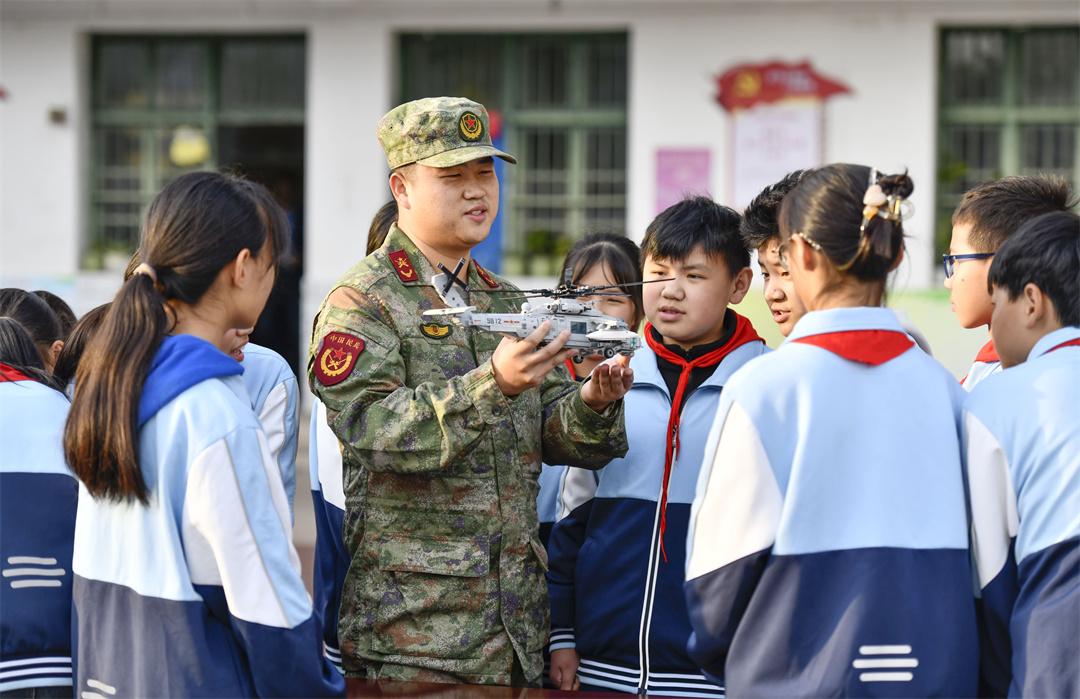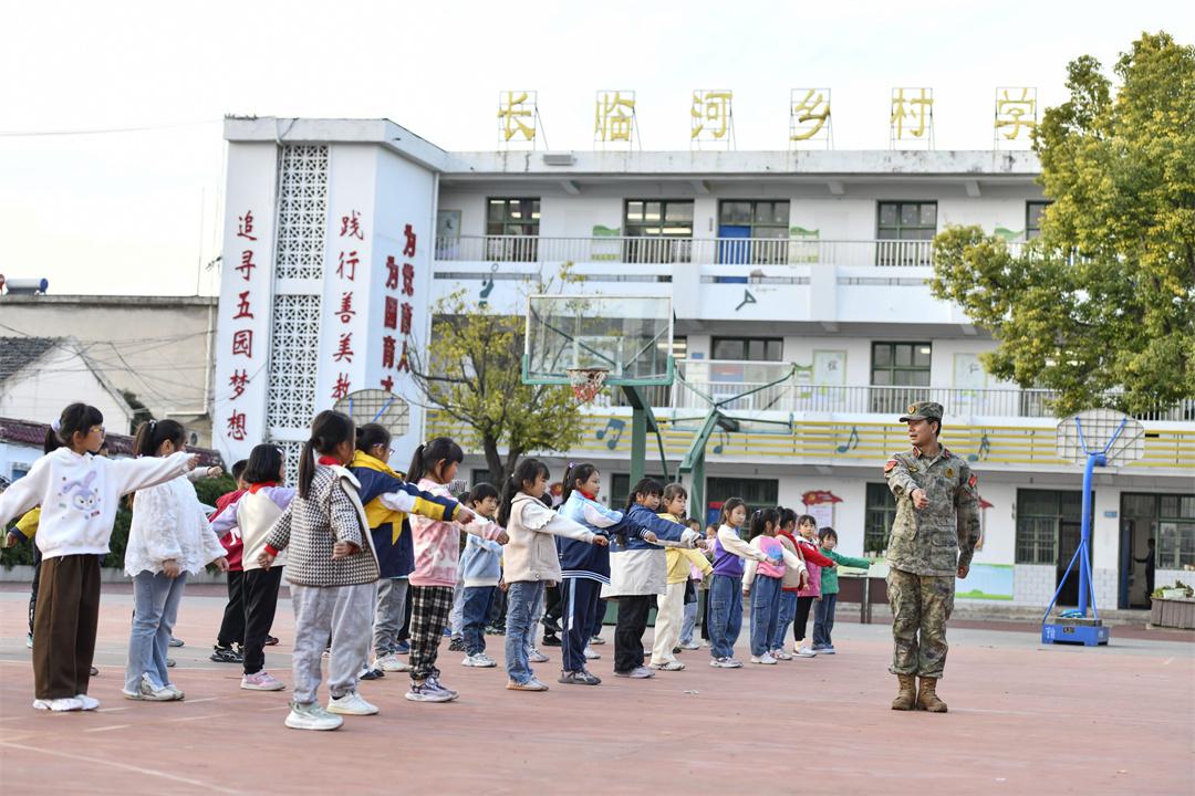 圖為在肥東縣長臨河學(xué)校中心小學(xué),某部指導(dǎo)員魏力源和孩子們在一起。