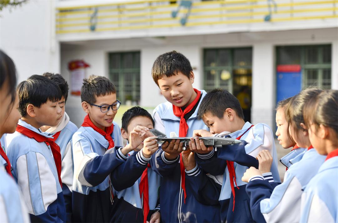 圖為在肥東縣長臨河學(xué)校中心小學(xué),孩子們觀摩裝備模型。