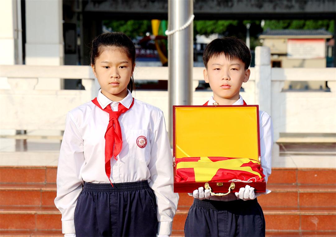 活動當(dāng)天,隨神舟十八號載人飛船進(jìn)入中國空間站并隨神舟十七號載人飛船返回地面的國旗在百色市第一小學(xué)進(jìn)行傳遞。活動中,廣西少先隊總輔導(dǎo)員代表將國旗傳遞到百色市少先隊員代表手中。少先隊員現(xiàn)場展示國旗后舉行了莊嚴(yán)的升國旗儀式。少先隊員代表在國旗下表達(dá)了對祖國的熱愛和對中國航天事業(yè)的向往,表示將把這份熱愛和期許化作實際行動,傳承紅色基因,刻苦學(xué)習(xí)、不斷進(jìn)取,努力成長為堪當(dāng)民族復(fù)興重任的時代新人。
