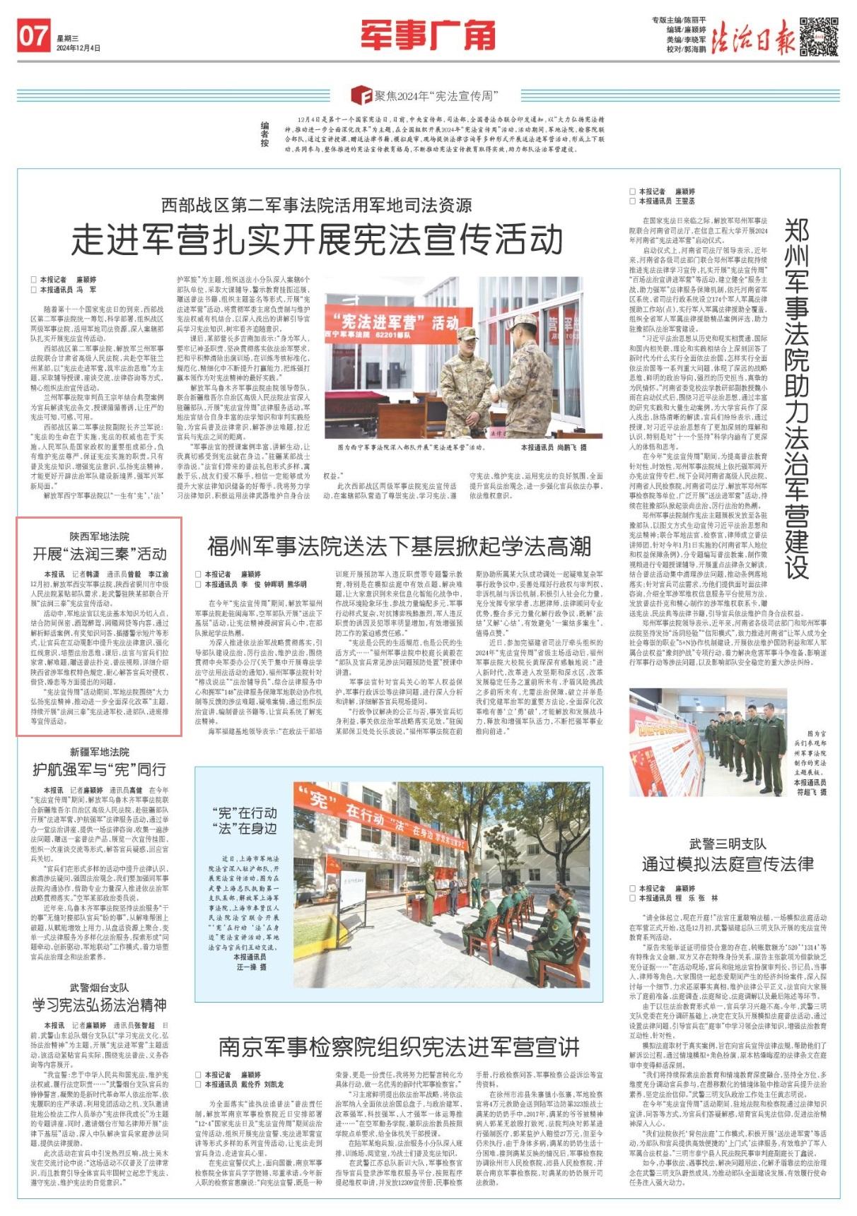 “憲法宣傳周”活動期間,軍地法院圍繞“大力弘揚憲法精神,推動進一步全面深化改革”主題,持續(xù)開展“法潤三秦”憲法進軍校、進部隊、進班排等宣傳活動。