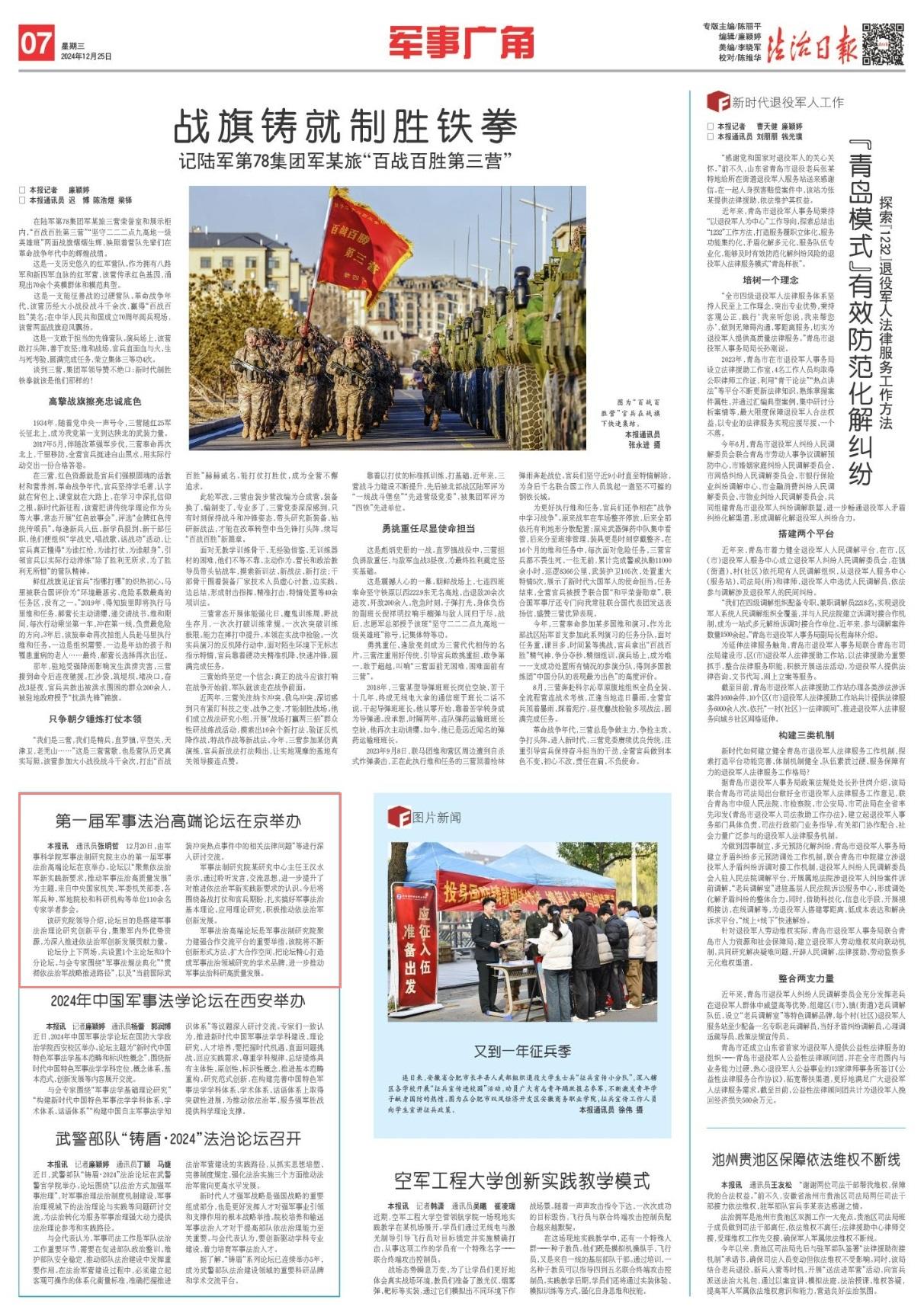 12月20日,由軍事科學(xué)院軍事法制研究院主辦的第一屆軍事法治高端論壇在京舉辦。論壇以“聚焦依法治軍新實(shí)踐新要求,推動(dòng)軍事法治高質(zhì)量發(fā)展”為主題,來自中央國家機(jī)關(guān)、軍委機(jī)關(guān)部委、各軍兵種、軍地院校和科研機(jī)構(gòu)等單位110余名專家學(xué)者參會(huì)。