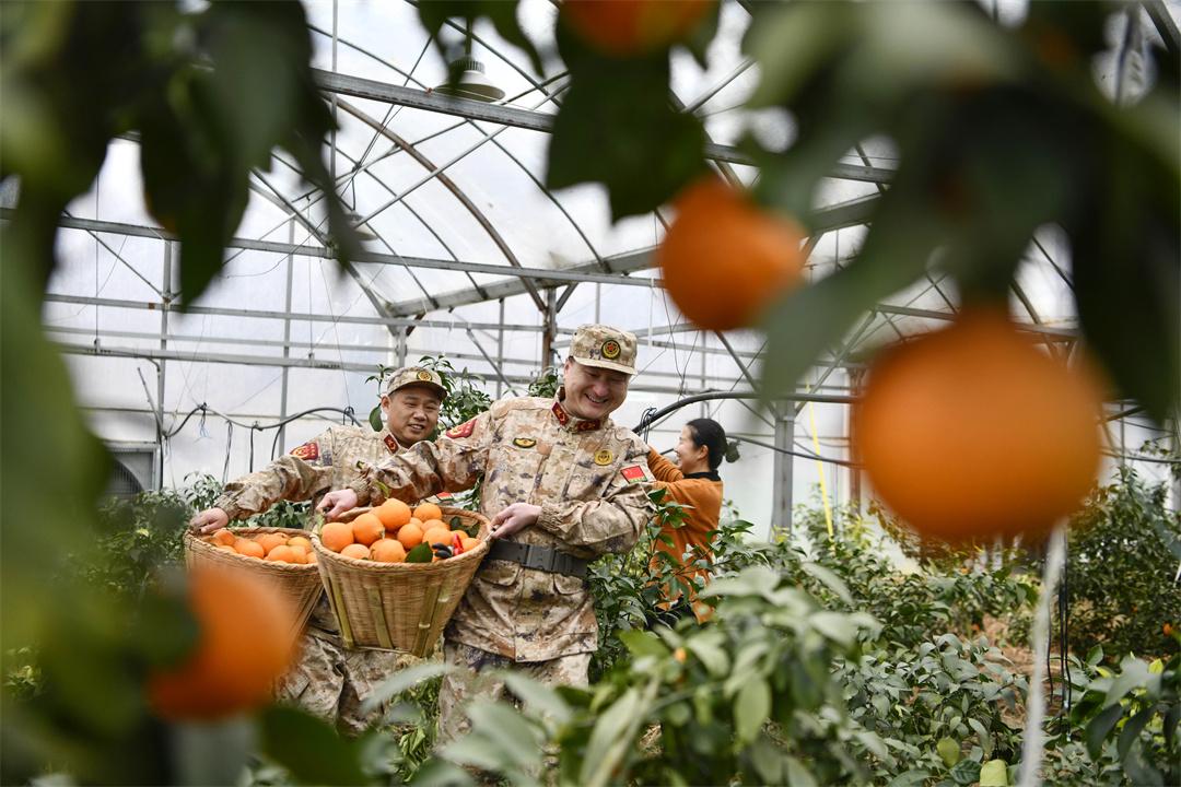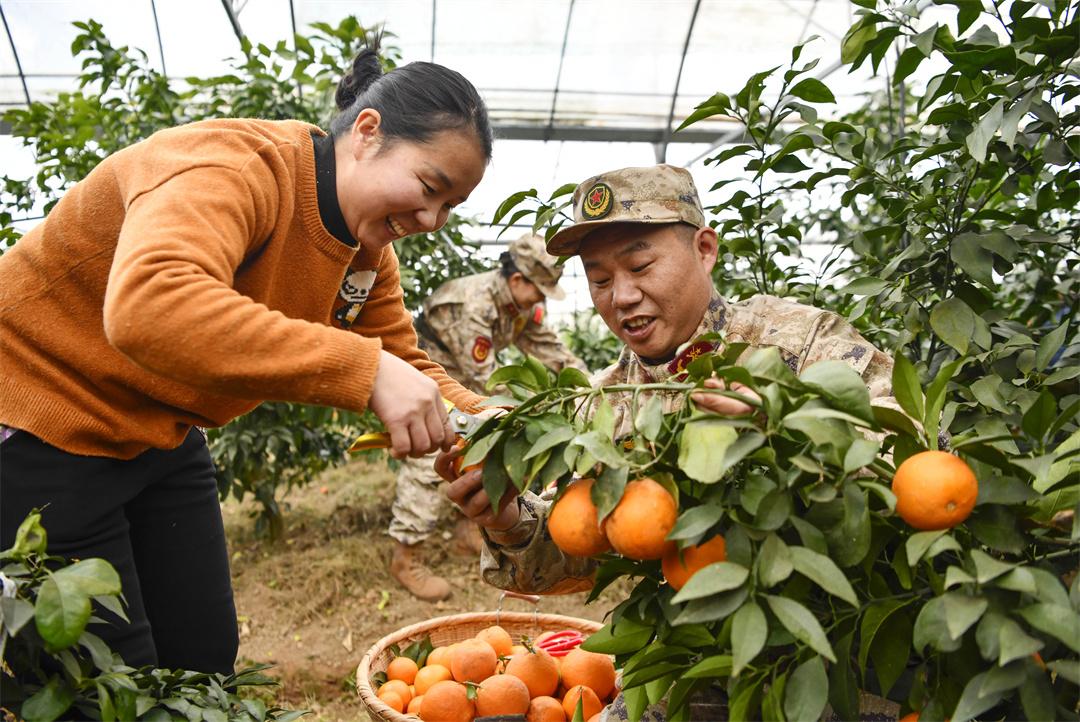 1月9日,安徽省合肥市廬江縣人武部組織“民兵助農志愿者小分隊”,來到廬江縣羅河鎮(zhèn)鮑店村幫助果農采收冬橙,搶抓時節(jié)供應市場。圖為民兵在鮑店村幫果農采摘冬橙。