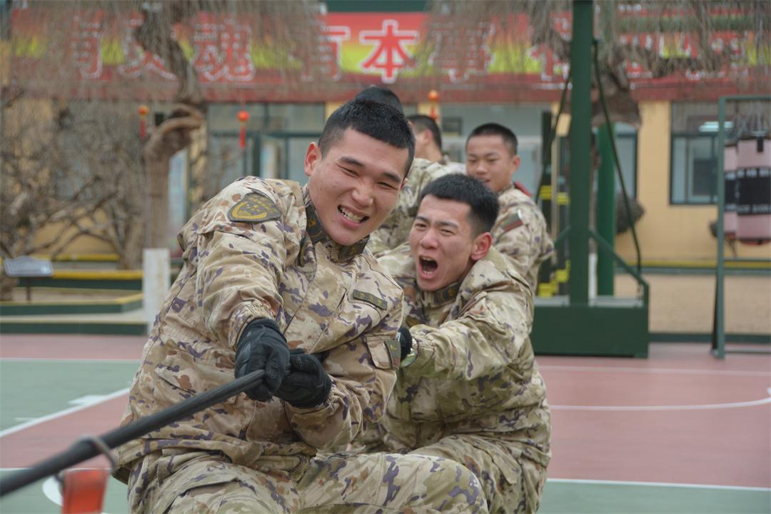 圖為拔河比賽,戰(zhàn)友們拼盡全力分毫不讓,勇奪第一。
