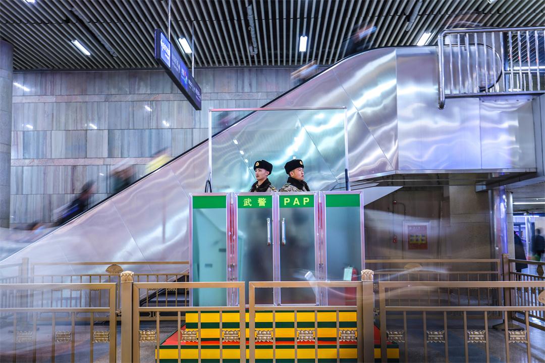 圖為兩名武警正在北京西站認(rèn)真執(zhí)勤。