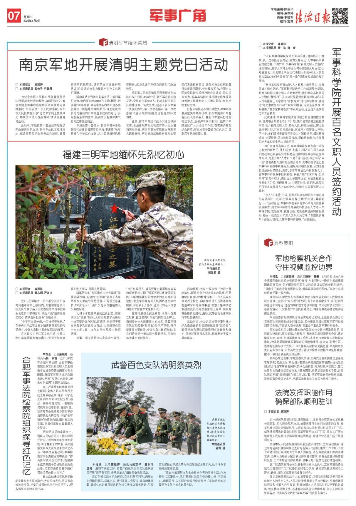 為紀(jì)念中國人民抗日戰(zhàn)爭暨世界反法西斯戰(zhàn)爭勝利80周年,清明節(jié)前夕,解放軍南京軍事檢察院聯(lián)合南京鐵路運(yùn)輸檢察院、江蘇省鎮(zhèn)江市人民檢察院、蘇州市人民檢察院開展“追憶滬寧線上抗戰(zhàn)烽火 賡續(xù)傳承偉大抗戰(zhàn)精神”清明主題黨日活動。