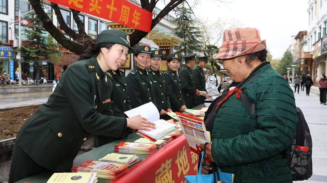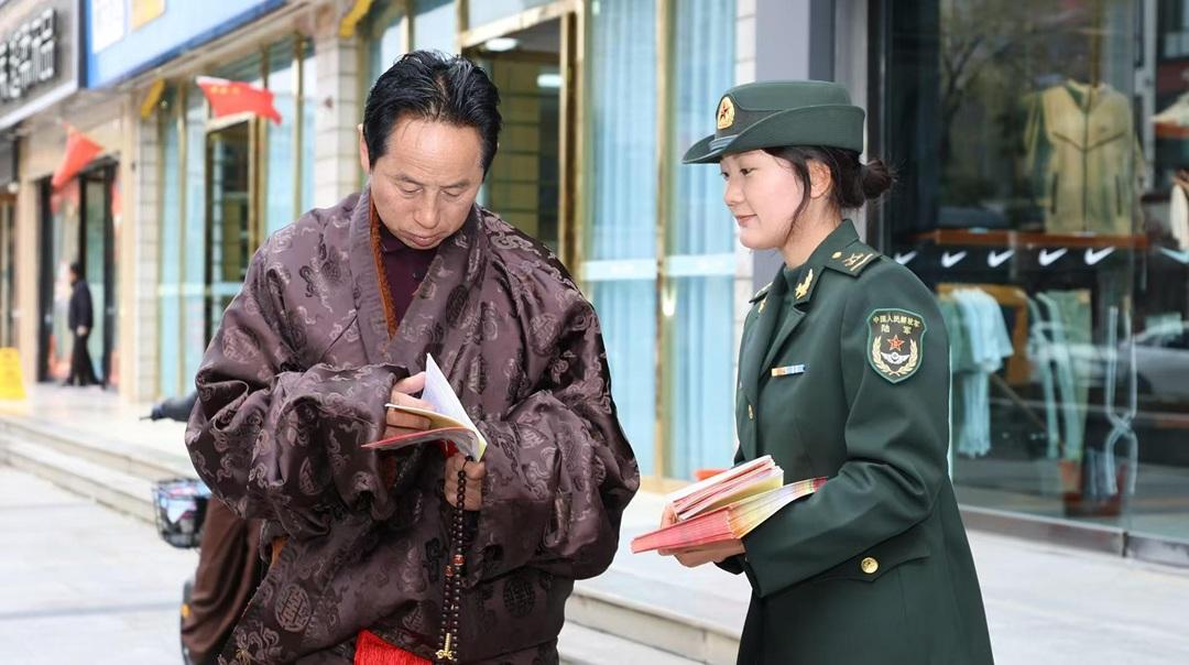 4月15日,解放軍拉薩軍事法院聯(lián)合拉薩警備區(qū)走上街頭,開展普法宣傳活動(dòng)。官兵們通過(guò)開展法律咨詢、設(shè)置普法展板、發(fā)放宣傳海報(bào)和書籍等形式,向群眾宣傳國(guó)家安全法、保密法等法律法規(guī)。