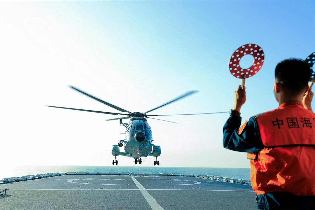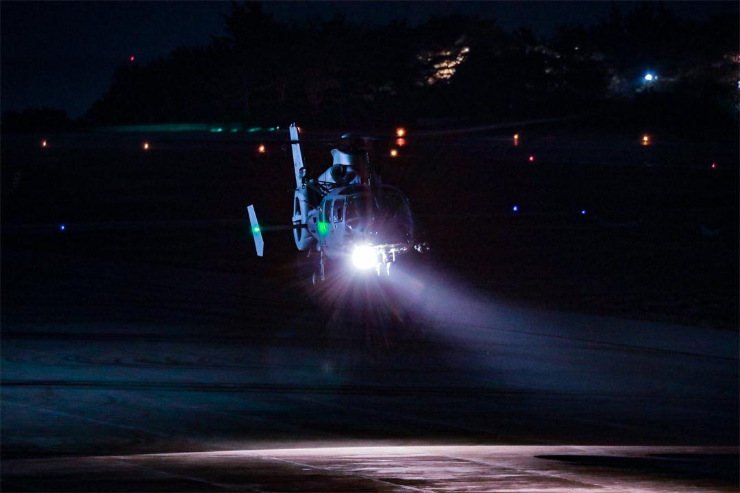 圖為海上跨晝夜平臺(tái)著艦飛行訓(xùn)練。