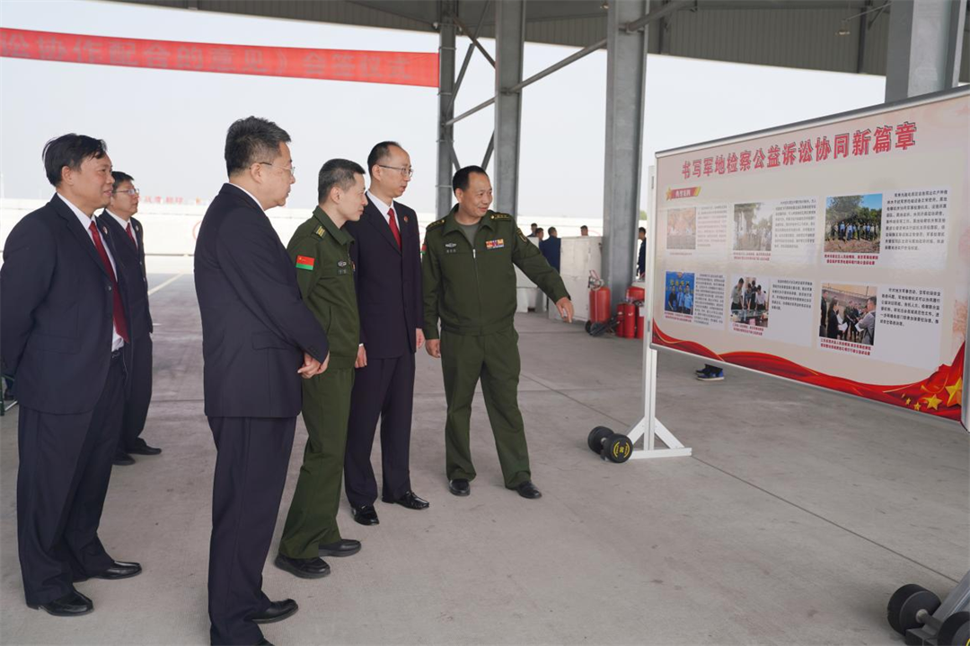 圖為與會人員參觀軍地檢察公益訴訟為保護軍事設(shè)施取得的成績。