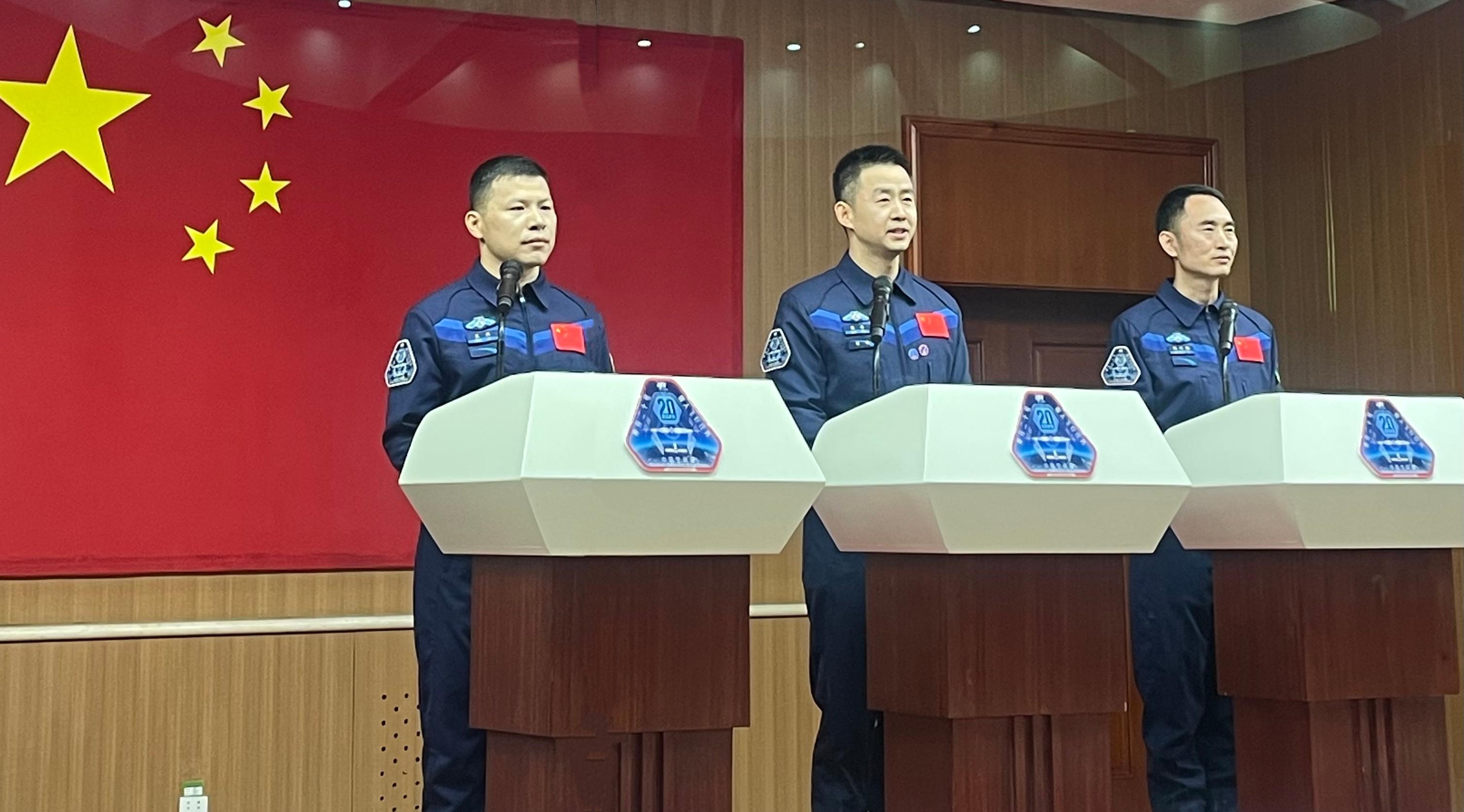 發(fā)布會后,3名航天員在酒泉衛(wèi)星發(fā)射中心問天閣與中外媒體記者集體見面。