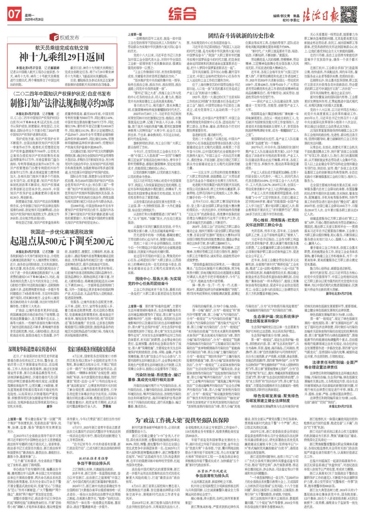 截至目前,神舟十九號(hào)航天員乘組已完成全部既定任務(wù),將于4月29日乘坐神舟十九號(hào)載人飛船返回東風(fēng)著陸場。