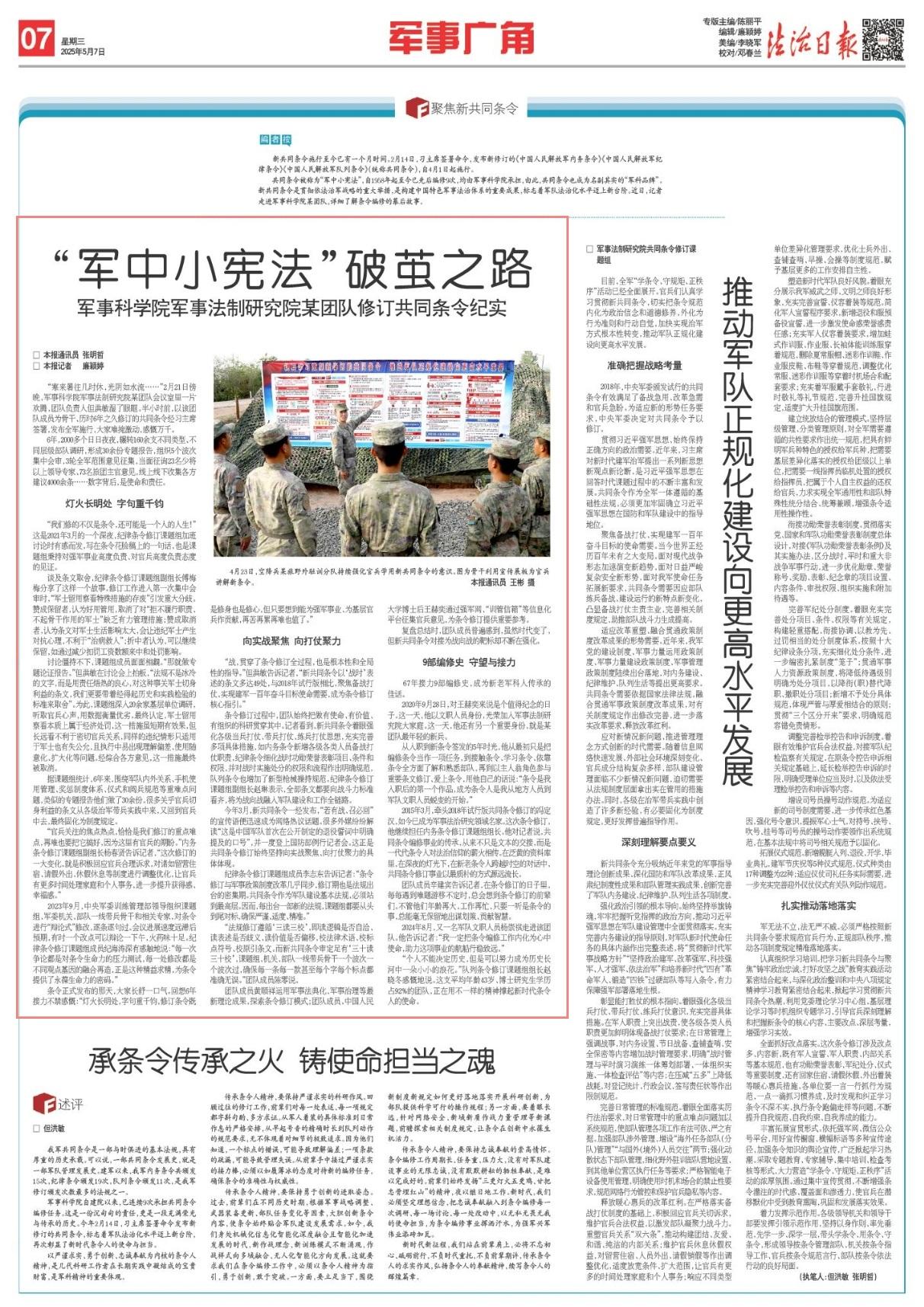 2015年3月,牽頭2018年試行版共同條令修訂的馮定漢,如今已成為軍事法治研究領(lǐng)域名家。這次條令修訂,他繼續(xù)擔(dān)任內(nèi)務(wù)條令修訂課題組組長。他對記者說,共同條令編修事業(yè)的傳承,從來不只是文本的交接,而是一代代條令人對法治信仰的薪火相傳。在泛黃的資料庫里,在深夜的燈光下,在新老條令人跨越時(shí)空的對話中,共同條令修訂事業(yè)以最質(zhì)樸的方式源遠(yuǎn)流長。
