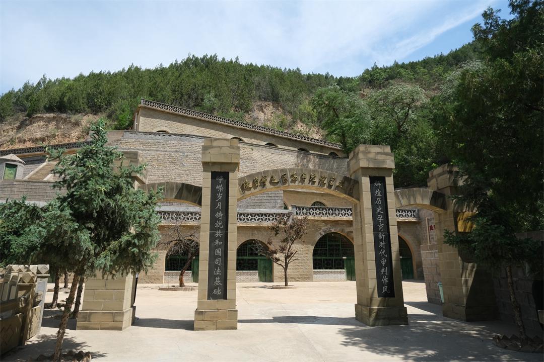 拾級而上,山頂一座莊嚴肅穆的三孔石拱門映入眼簾,“陜甘寧邊區(qū)高等法院舊址”11個鎦金大字在石拱門正中,兩側(cè)題寫“崢嶸歲月鑄就共和國司法基礎(chǔ) 輝煌歷史孕育新時代審判作風(fēng)”。