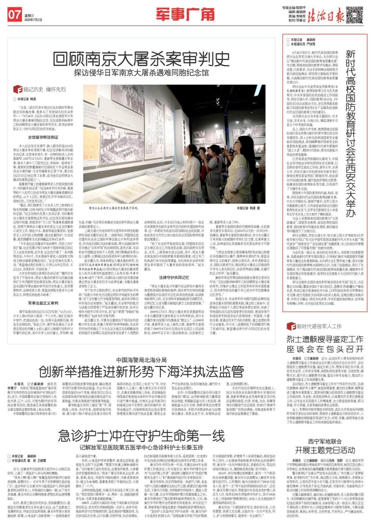 6月26日至27日,新時(shí)代高校國防教育研討會在西安交通大學(xué)舉辦。本次研討會以“推動新時(shí)代高校國防教育高質(zhì)量發(fā)展”為主題,圍繞高校國防教育學(xué)科建設(shè)、課程設(shè)置、內(nèi)容要求、方法手段和特點(diǎn)規(guī)律等方面交流經(jīng)驗(yàn)做法、研究探討面臨的矛盾問題,共商推動新時(shí)代高校國防教育高質(zhì)量發(fā)展大計(jì)。