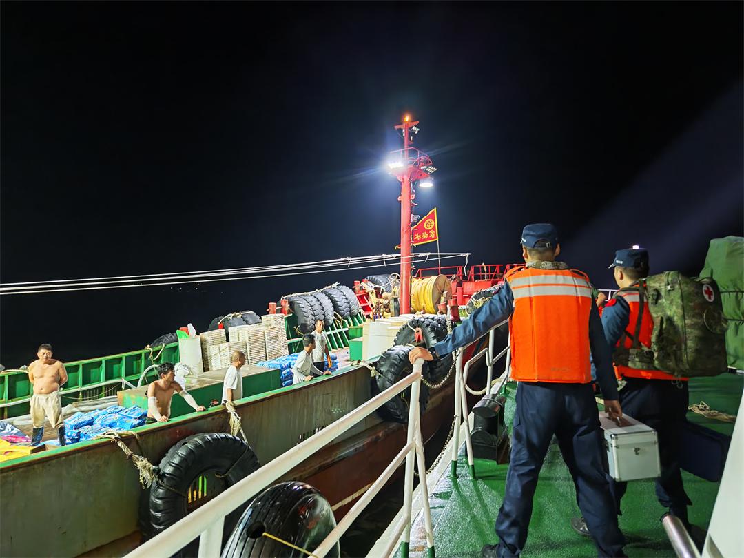由于夜間航行,海上能見度較差,且事發(fā)海域周邊漁網較多,給航行帶來較大困難,永隆艦執(zhí)法員們憑借出色的駕駛技能和豐富夜航經驗,克服諸多不利因素,穩(wěn)慎駕駛艦艇趕往事發(fā)海域。航行中,執(zhí)法員們通過多種通信方式與求助漁船保持聯(lián)系,動態(tài)掌握船舶位置及傷員情況,隨艦醫(yī)護人員遠程指導漁船其他人員為傷者開展先期輔助治療。