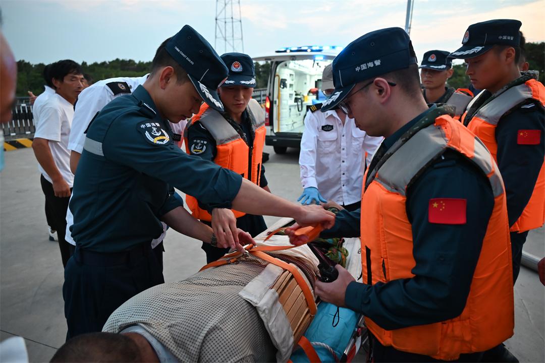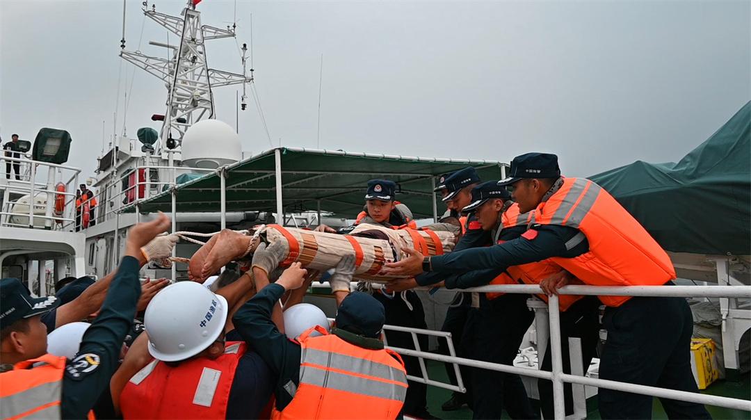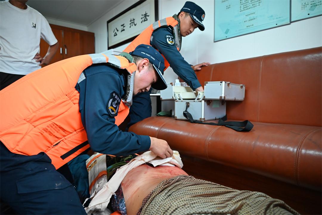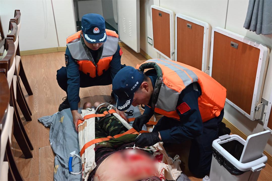 海警執(zhí)法員看準時機在兩船并靠瞬間果斷跳幫,登船緊急開展消毒止血、包扎固定等處理后,與漁政工作人員合力將傷員轉(zhuǎn)運至海警執(zhí)法艇。隨艇醫(yī)護人員持續(xù)觀察救治,安撫傷員情緒,與此同時,崇明海警局聯(lián)系駐地醫(yī)院安排救護車趕赴碼頭轉(zhuǎn)接傷員。