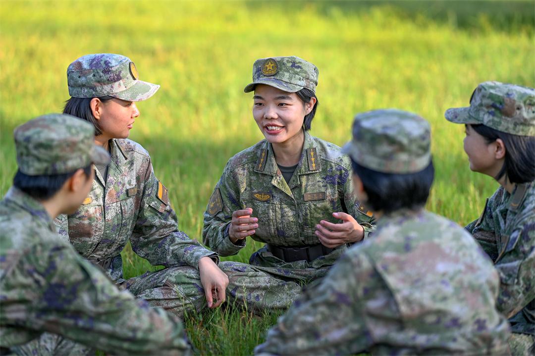 圖為訓練間隙,陳東森(中)組織班組女兵集體談心。