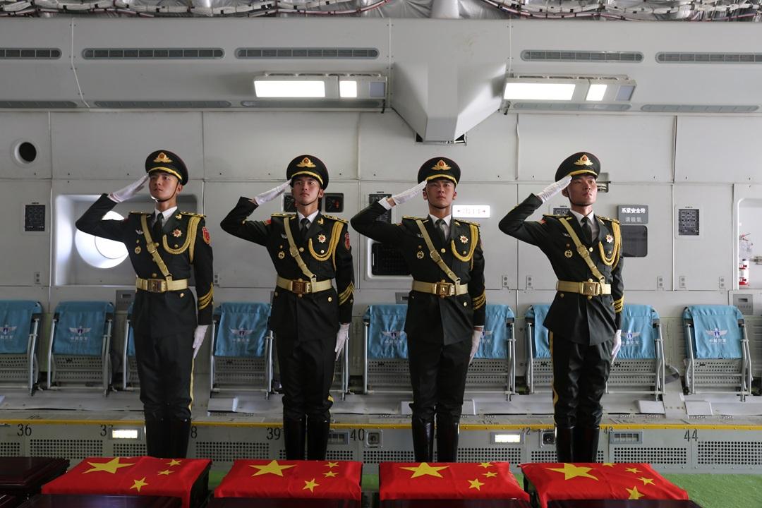 圖為中國空軍運(yùn)-20機(jī)艙內(nèi)禮兵面向志愿軍英烈棺槨敬禮。王鴻飛 攝