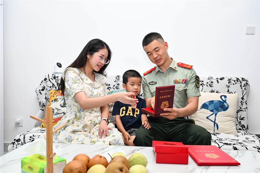 圖為趙陽給孩子講述自己勛章背后的故事。