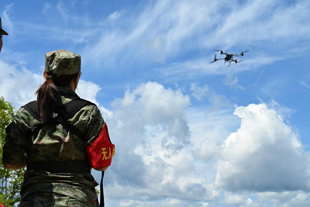圖為“一曼”女子民兵分隊無人機操作手進行課目演示。
