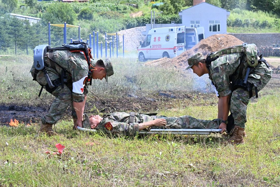 圖為“綠盾”特色民兵分隊使用外骨骼設備進行戰(zhàn)場傷員救治課目演示。