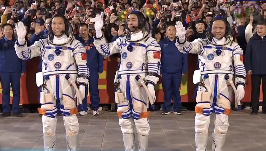20時49分,張陸、武飛、張洪章3名航天員領命出征??臻g站應用與發(fā)展階段飛行任務總指揮部有關成員以及航天科技人員、各族群眾代表在現(xiàn)場為航天員乘組壯行。