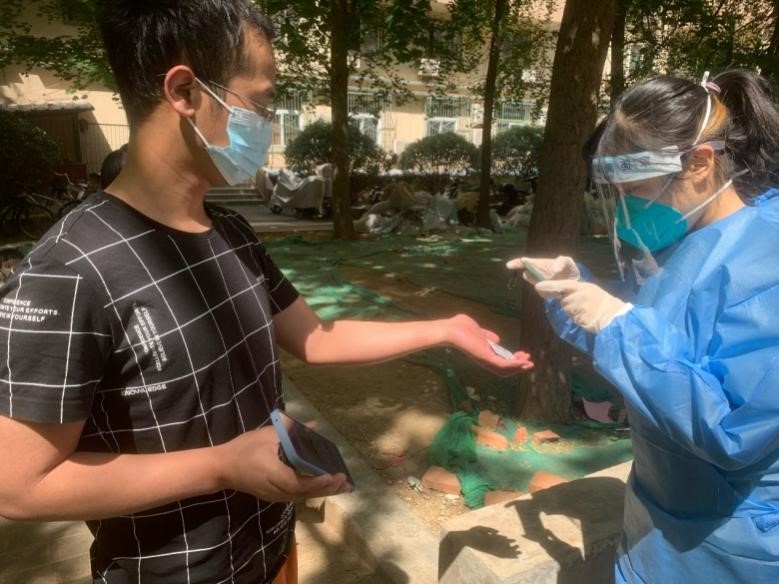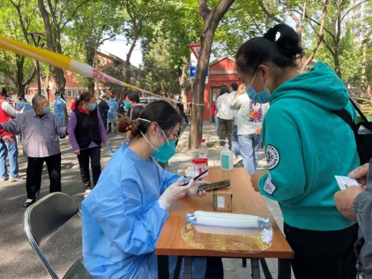 5月3日早6點,我和院里一行18名志愿者已在百萬莊社區(qū)集結(jié)就位了。登記身份信息、引導(dǎo)排隊秩序、解答群眾疑問……對于這些流程,志愿者們都已經(jīng)非常熟練,我和小伙伴們默契地迅速就位,投入了工作。今天,為了提高檢測效率,我領(lǐng)到了“高級任務(wù)”:協(xié)助醫(yī)生開展采樣。