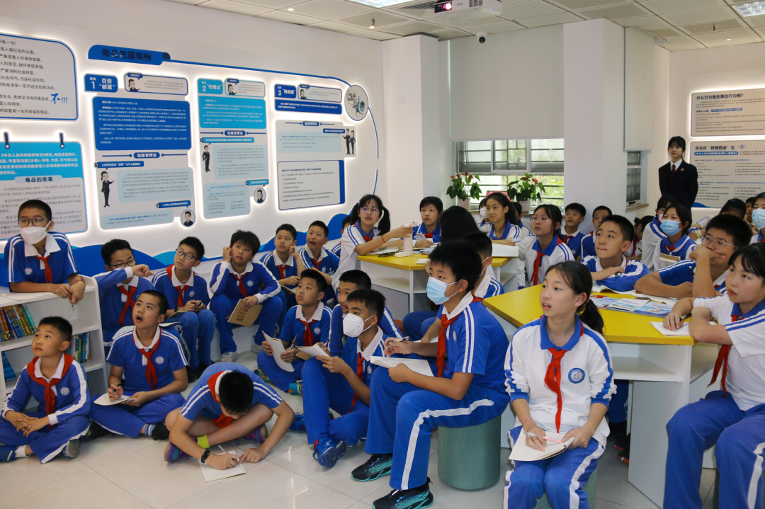 活動中,檢察人員帶領(lǐng)同學(xué)們先后參觀了憲法墻、未成年人檢察辦案工作室、心理咨詢室、家庭教育指導(dǎo)工作站等區(qū)域,接受法治文化熏陶。在法治教育基地,檢察人員通過具體案例,以互動教學(xué)的形式為同學(xué)們講解校園欺凌、毒品犯罪以及未成年人保護法等內(nèi)容,引導(dǎo)同學(xué)們警惕、抵制不良風(fēng)氣和違法犯罪行為,提高自我保護能力。