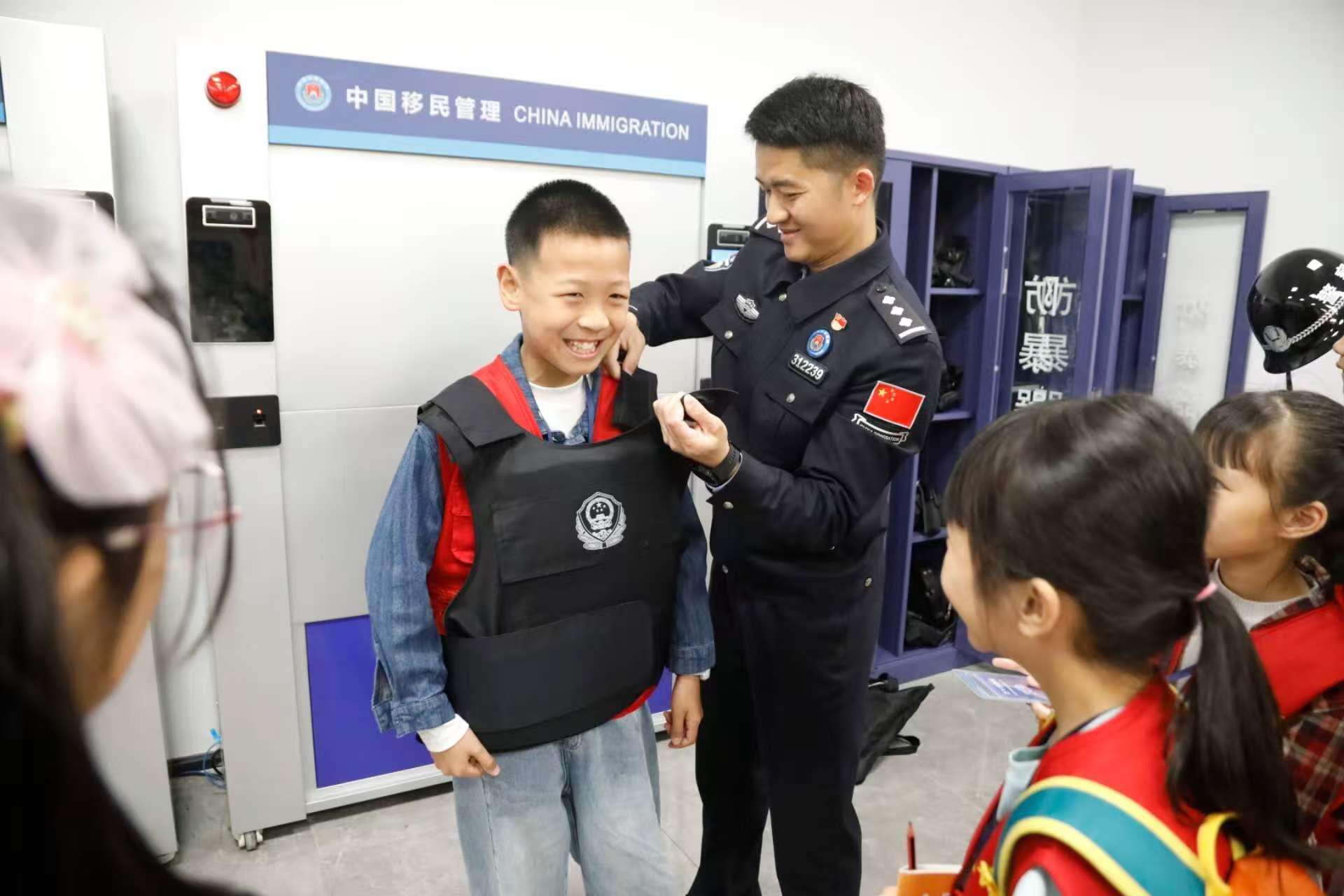 小學(xué)生們?cè)谝泼窆芾砭斓膸ьI(lǐng)下,先后參觀了新口岸出境大廳、碼頭泊位及入境大廳,現(xiàn)場體驗(yàn)穿戴警用裝備。