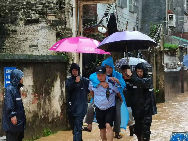 6月16日下午,懷集縣公安局鳳崗派出所與鎮(zhèn)政府工作人員在鳳崗舊圩冒雨轉(zhuǎn)移受災群眾。李明烘 攝