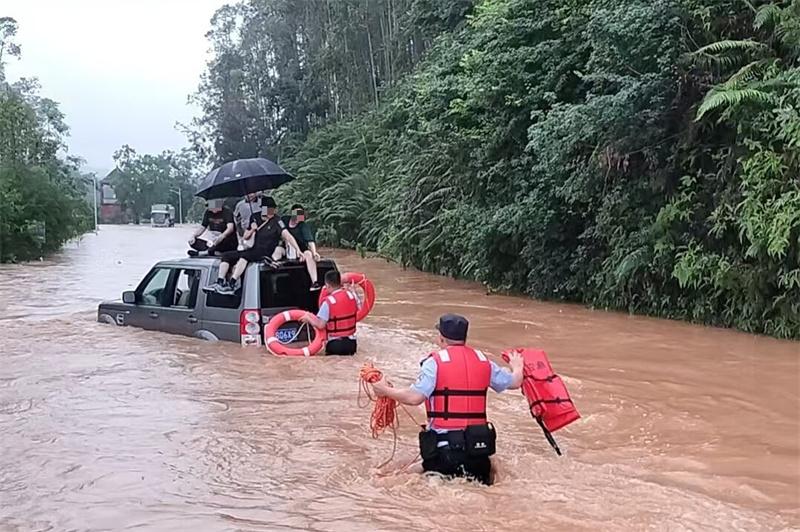 6月17日下午,懷集公安接到群眾緊急求助,稱中洲鎮(zhèn)泰西村路段有5人被困在兩輛車的車頂。轄區(qū)派出所民警接報后迅速驅(qū)車趕赴現(xiàn)場,蹚過齊腰深的洪水靠近被困車輛,成功將5名被困人員全部救出。