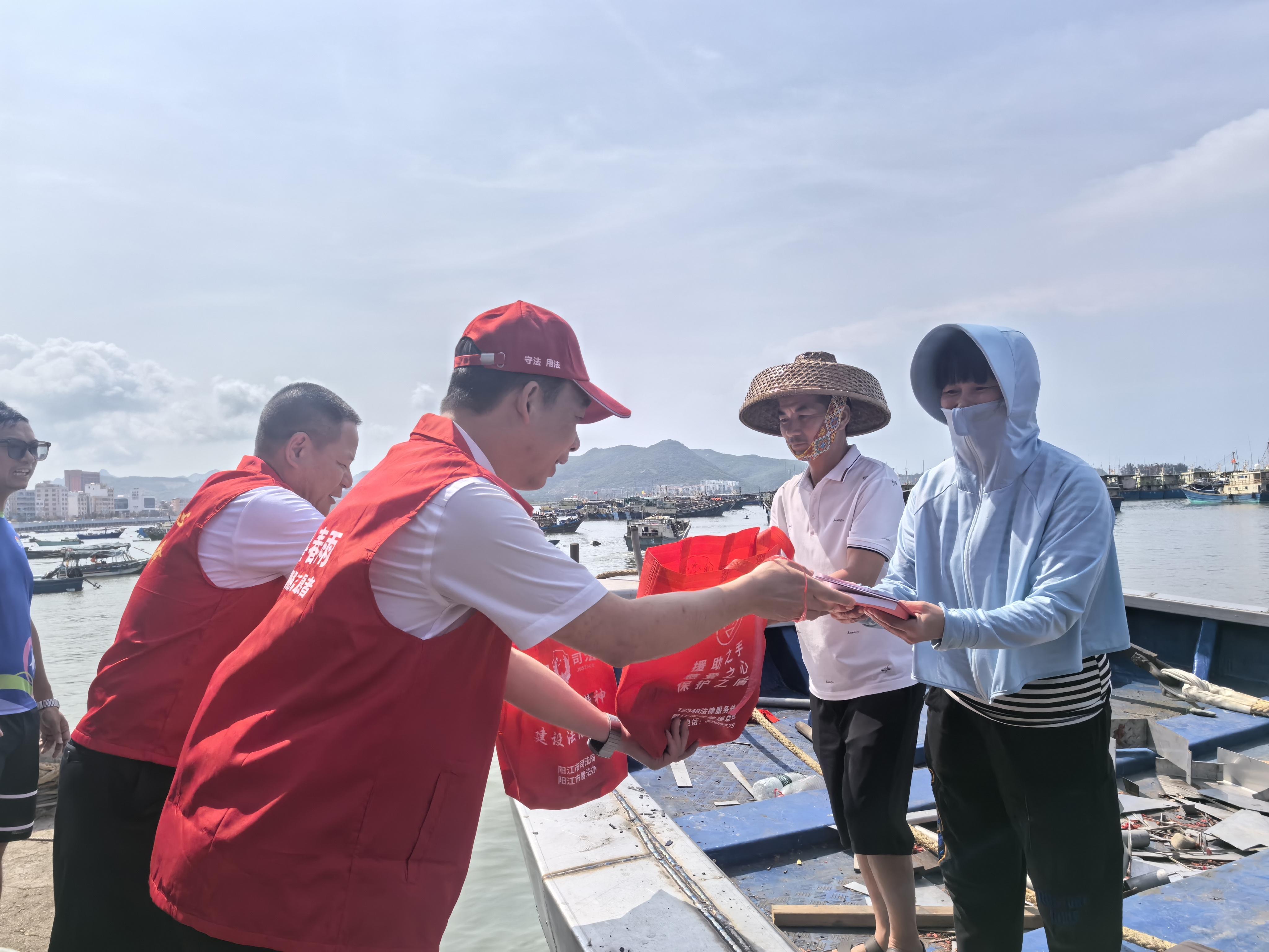 “師傅,這是民法典和法律援助指南,遇到糾紛可以照著上面的指引找我們!”休漁期的陽(yáng)東區(qū)東平鎮(zhèn)、陽(yáng)西縣沙扒鎮(zhèn)漁港內(nèi),普法志愿者分組登上漁船,將沉甸甸的“法治大禮包”送到漁民手中。