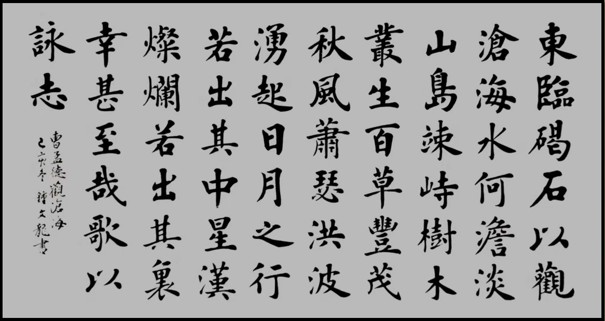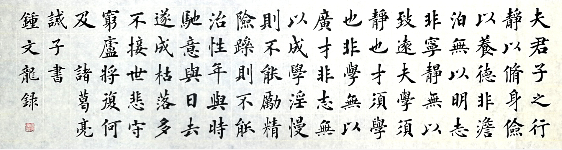 2010年,鐘文龍拜盧中南先生為師,由于自身基礎(chǔ)牢固加之得到名師指點(diǎn),其楷書技藝得以迅速提高,大幅飛躍。