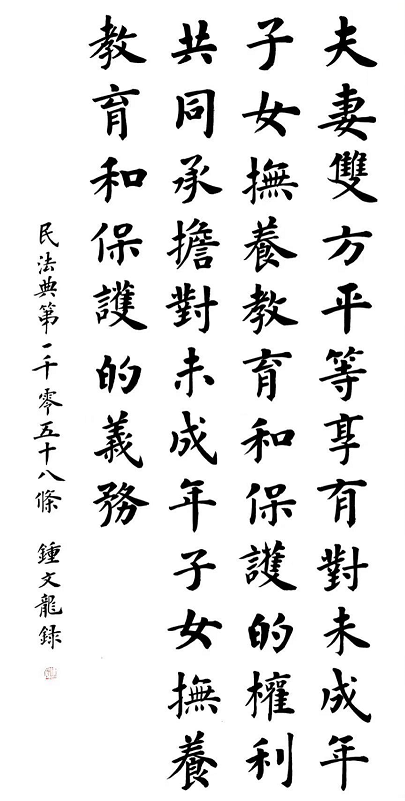 2020年7月11日,司法部普法與依法治理局和法制日?qǐng)?bào)社共同主辦了“書·法”系列活動(dòng)。鐘文龍先生應(yīng)邀書寫民法典第一千零五十八條: “夫妻雙方平等享有對(duì)未成年子女撫養(yǎng)、教育和保護(hù)的權(quán)利,共同承擔(dān)對(duì)未成年子女撫養(yǎng)、教育和保護(hù)的義務(wù)。”因其作品周正雅致而頗受好評(píng)。