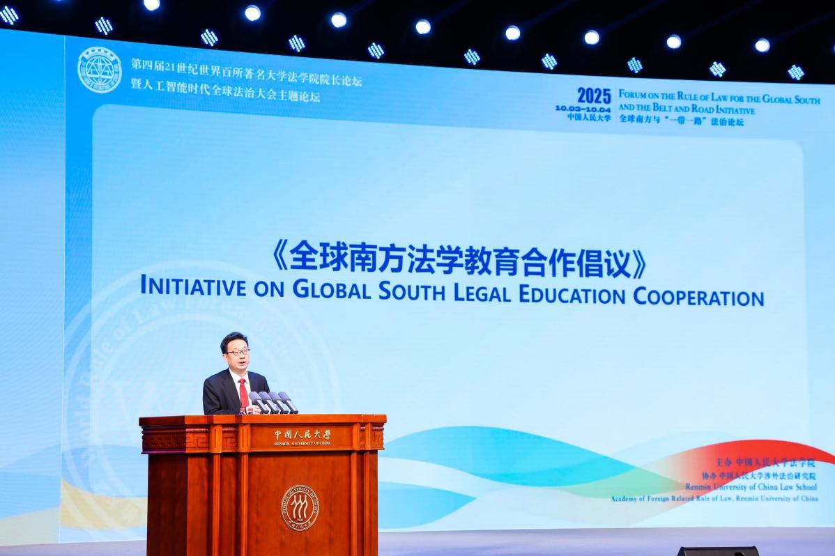 圖為中國(guó)人民大學(xué)法學(xué)院院長(zhǎng)楊東在論壇主會(huì)場(chǎng)開(kāi)幕式上發(fā)布《全球南方法學(xué)教育合作倡議》。