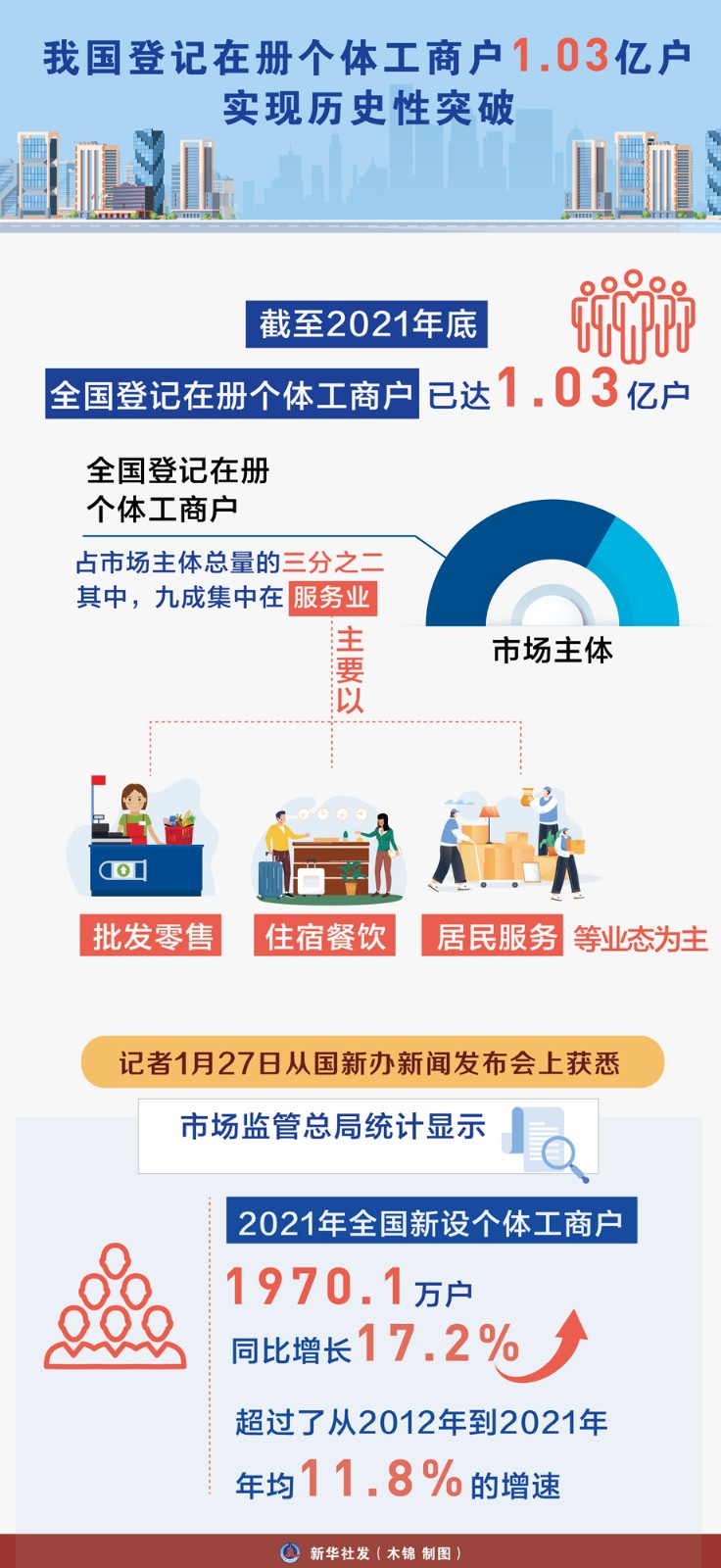 我國登記在冊(cè)個(gè)體工商戶邁上1億戶臺(tái)階,實(shí)現(xiàn)歷史性突破。截至2021年底,全國登記在冊(cè)個(gè)體工商戶已達(dá)1.03億戶,占市場(chǎng)主體總量的三分之二。其中,九成集中在服務(wù)業(yè),主要以批發(fā)零售、住宿餐飲和居民服務(wù)等業(yè)態(tài)為主。
