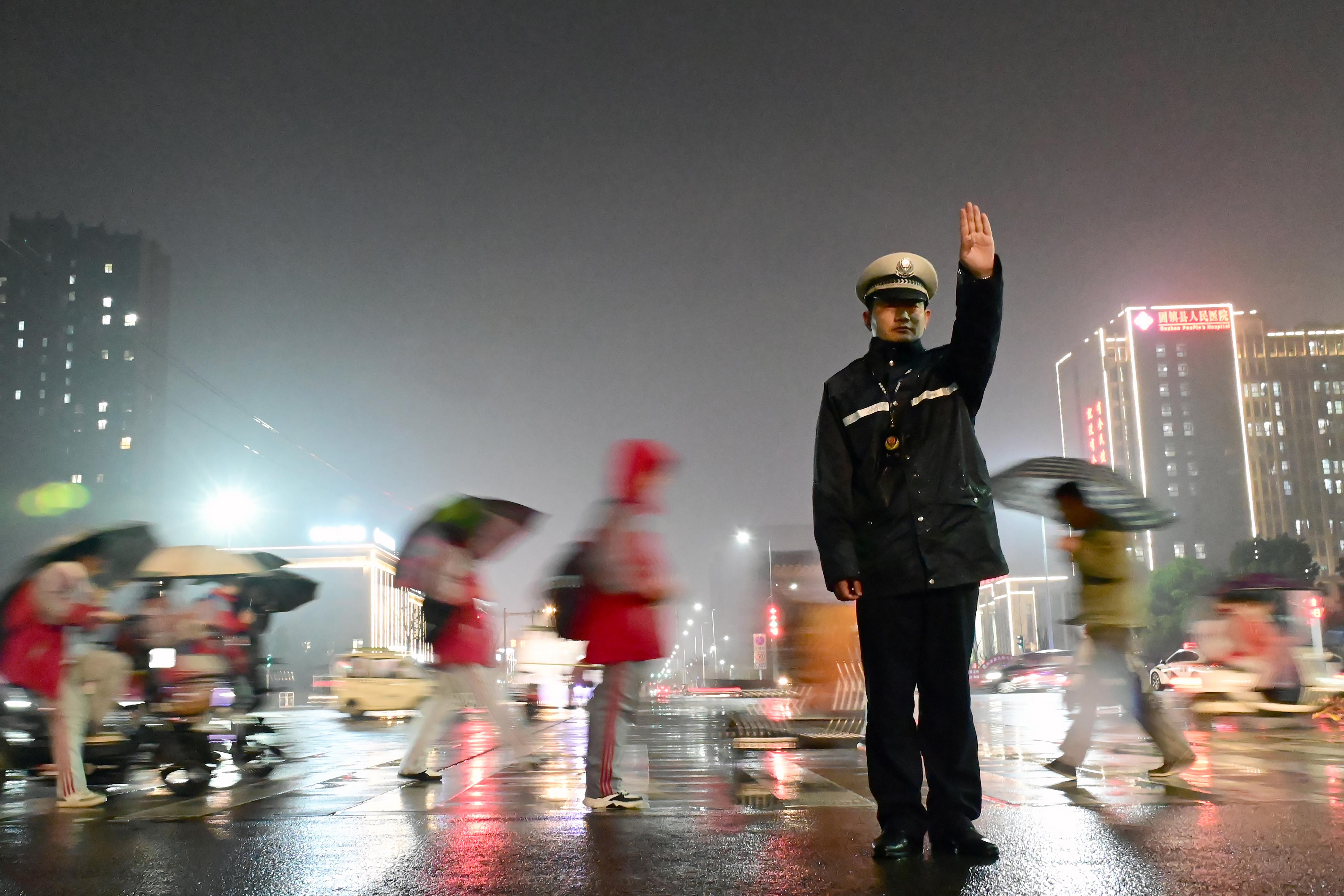 3月22日晚,安徽省固鎮(zhèn)縣公安局交管大隊民警冒雨在第三中學(xué)路段指揮疏導(dǎo)交通。針對中學(xué)生晚自習放學(xué)時間晚、出行集中情況,固鎮(zhèn)縣公安局交管大隊組織警力強化夜間“護學(xué)崗”,確保學(xué)生安全。