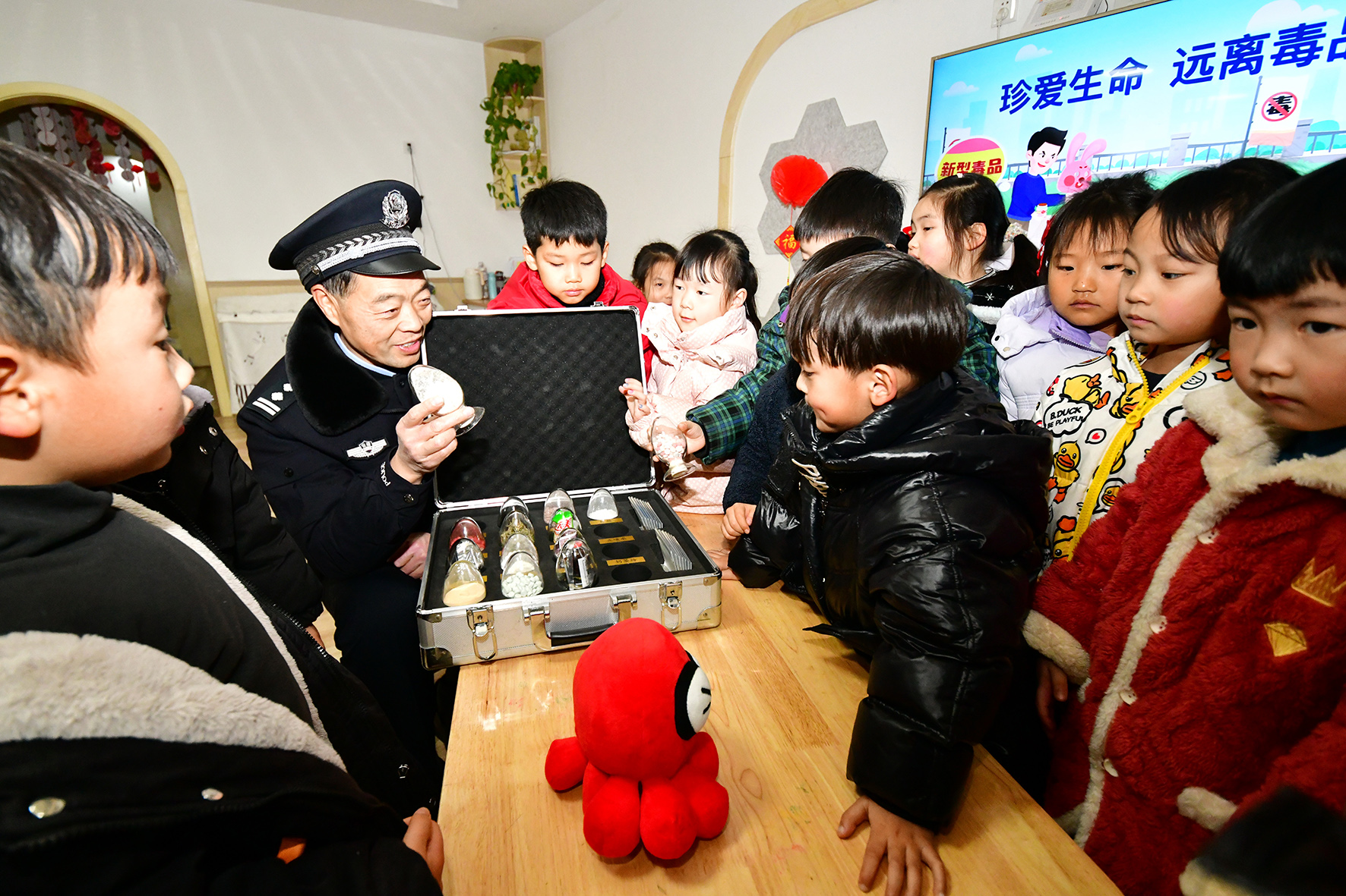 1月17日,安徽省阜南縣公安局城關派出所民警在鹿城幼兒園向孩子們講解如何辨別毒品。寒假臨近,阜南縣公安局城關派出所組織民輔警走進轄區(qū)中小學校及幼兒園開展“珍愛生命 遠離毒品”宣傳活動。