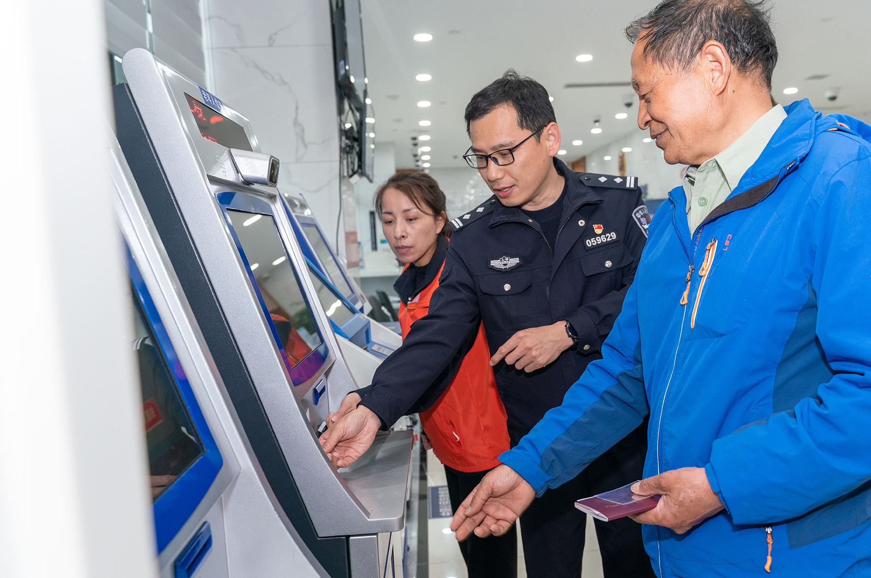 圖為4月17日,民警協(xié)助群眾通過自助簽注設(shè)備辦理業(yè)務(wù)。