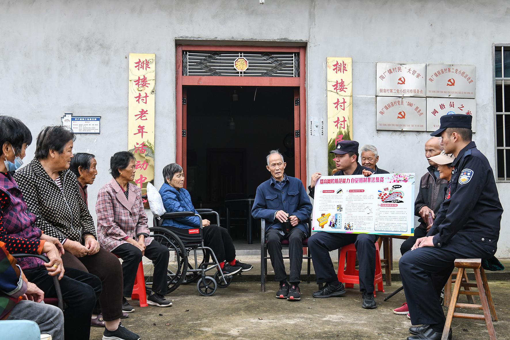 10月17日,安徽省馬鞍山市含山縣公安局陶廠派出所組織民警走進排樓村,向老年人開展防詐騙知識宣傳。