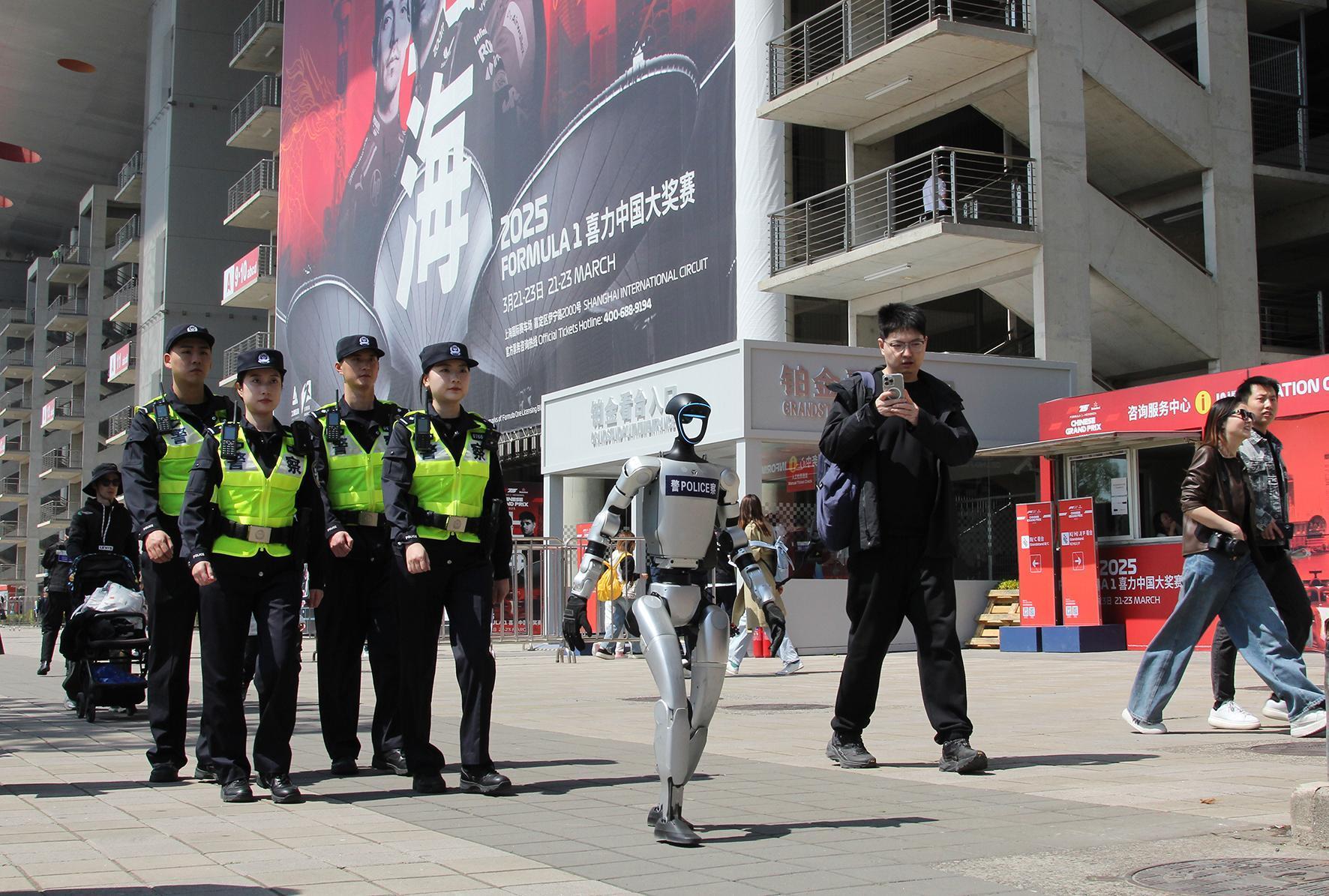 圖為民警與智能機(jī)器人在上海國(guó)際賽車場(chǎng)開展融合巡防。