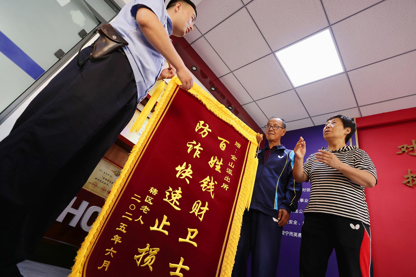 6月16日,一對(duì)老年夫妻來(lái)到遼寧省本溪市公安局明山分局金山派出所,將精心制作的錦旗送到民警手中,感謝民警及時(shí)幫助老人識(shí)破騙局,保住了養(yǎng)老救命錢(qián)。