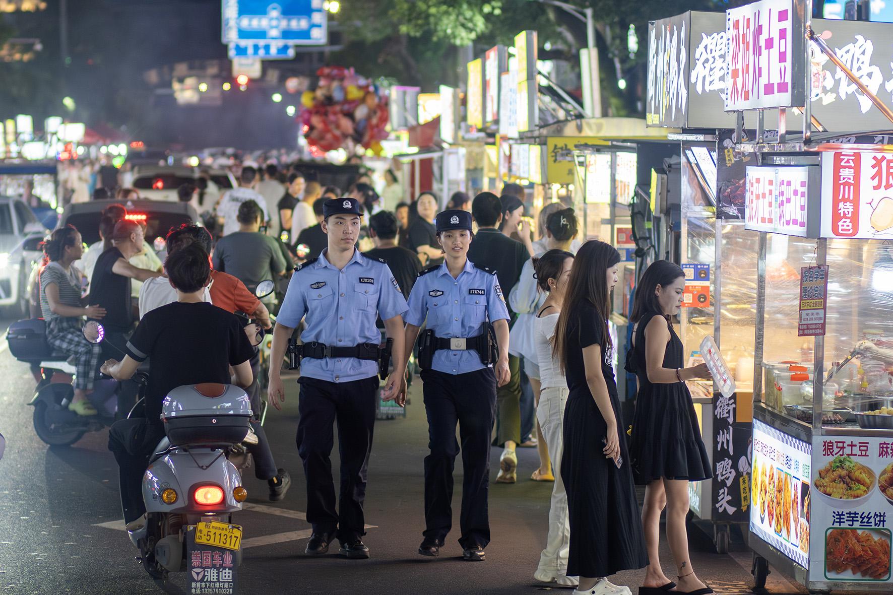 6月30日夜,浙江省臺州市公安局黃巖分局新前派出所民警輔警在西范夜市巡邏。入夏以來,臺州市公安局黃巖分局積極部署對城鄉(xiāng)夜市的巡邏防控,提升見警率,守護(hù)民間“煙火氣”,助力“夜經(jīng)濟(jì)”發(fā)展。