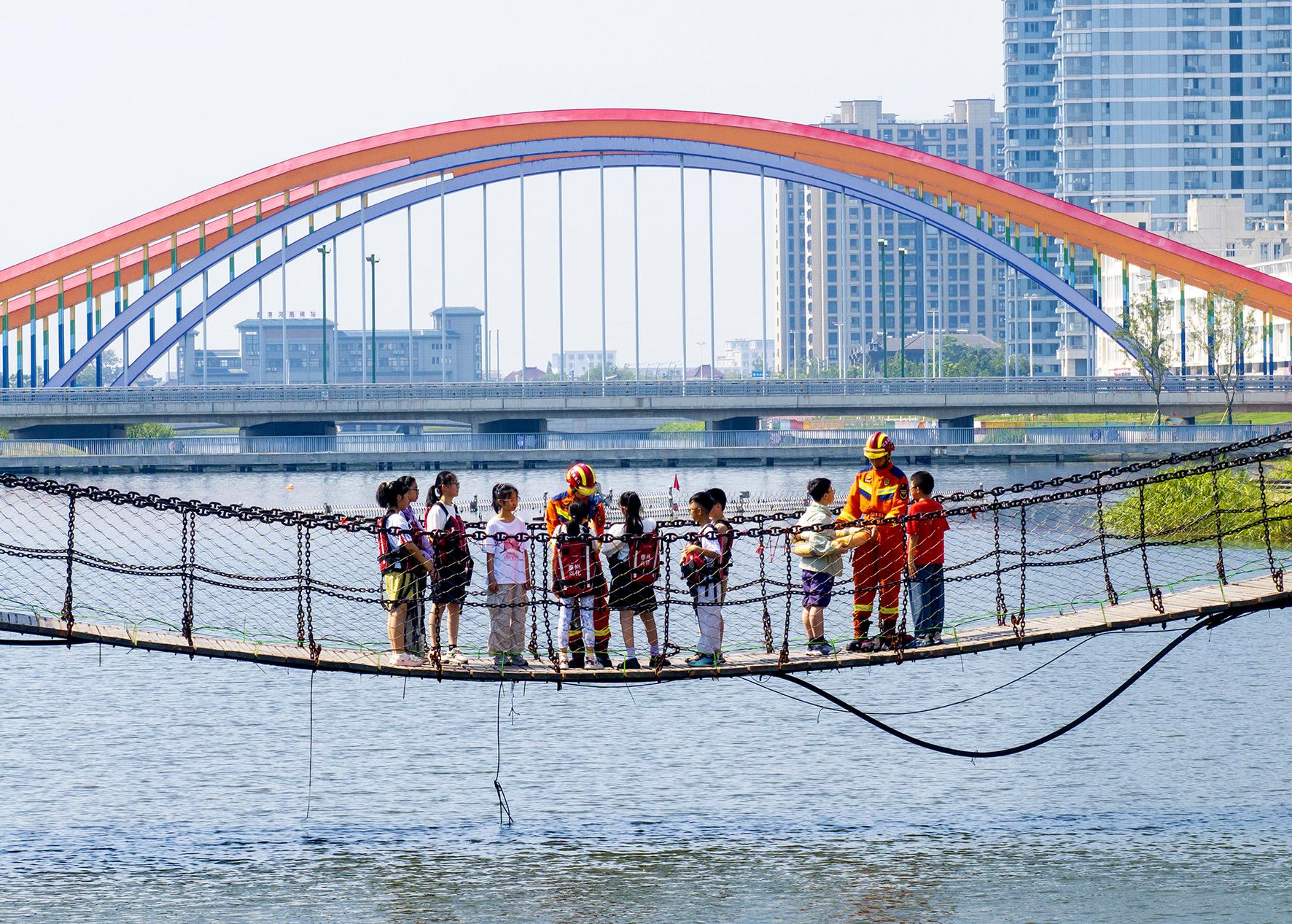 7月2日,在江蘇省興化市昭陽湖公園,興化市消防救援大隊消防員指導(dǎo)興化市新生中心小學(xué)“日新公益暑托班”學(xué)生學(xué)習(xí)防溺水自救互救的基本知識與技能。