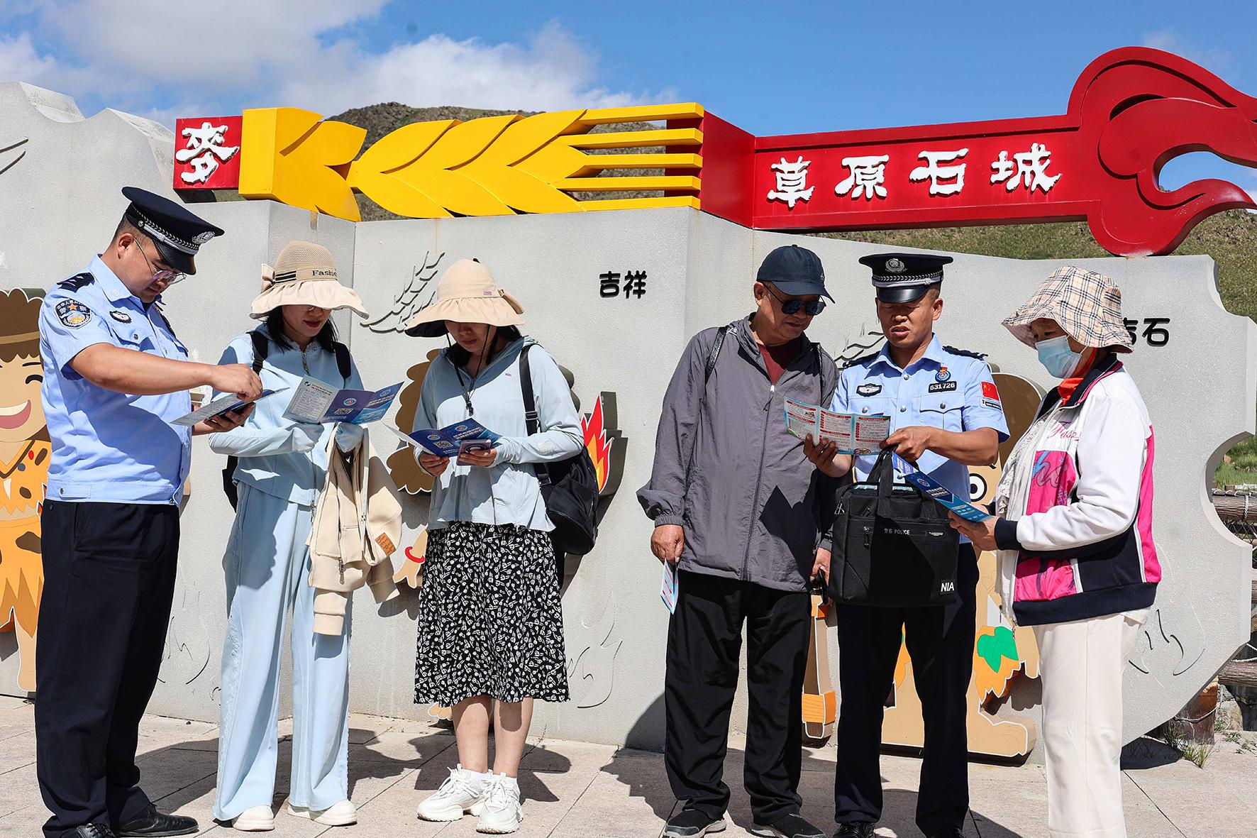 7月9日,新疆阿勒泰邊境管理支隊(duì)托斯特邊境派出所民警走進(jìn)轄區(qū)草原神石城景區(qū),向游客普及防范電信網(wǎng)絡(luò)詐騙知識(shí)。