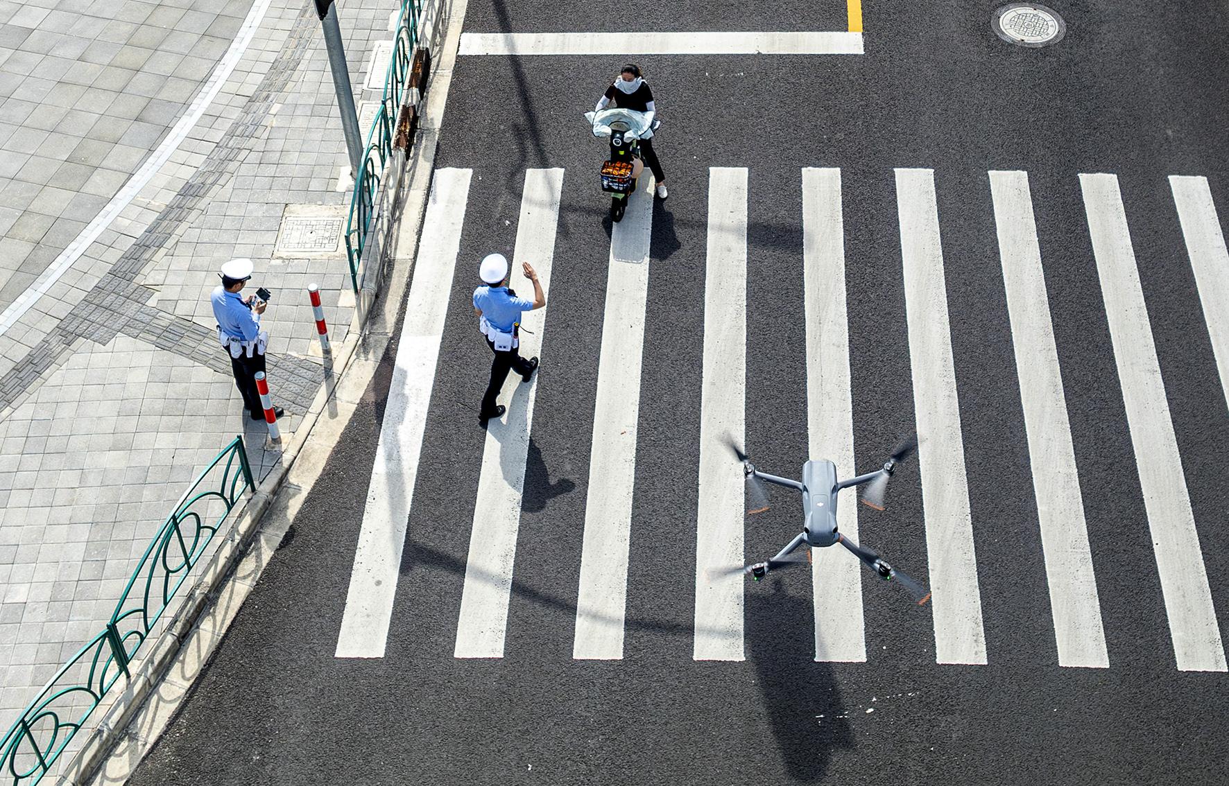圖為7月22日,民輔警利用無人機(jī)查處一起非機(jī)動車交通違法行為。