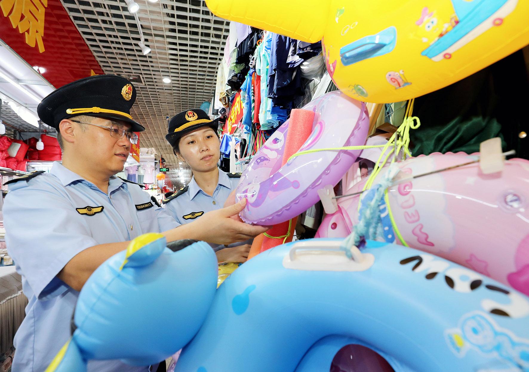 7月20日,安徽省淮北市相山區(qū)市場監(jiān)管部門組織執(zhí)法人員開展夏季游泳用品專項(xiàng)檢查。