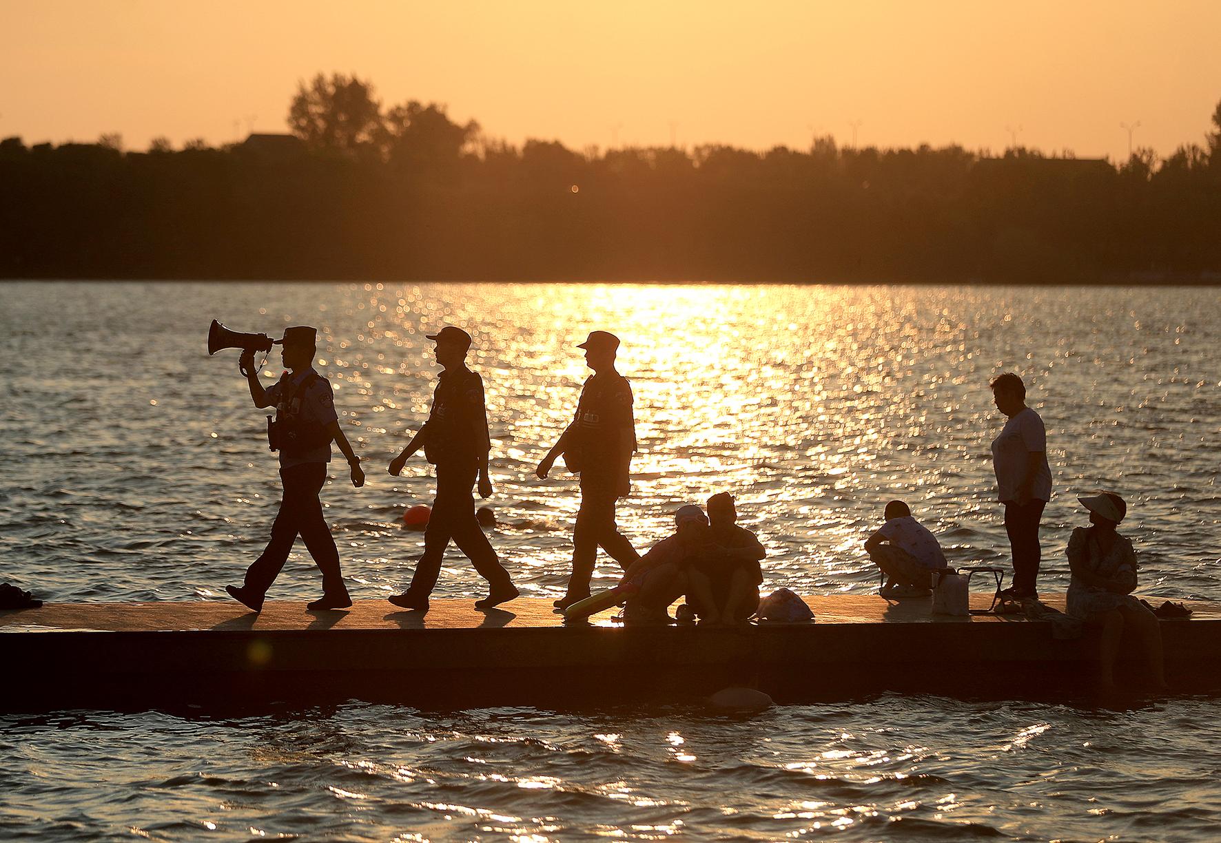 “水深危險,請勿游泳!”7月28日傍晚,湖北省荊門市公安局巡特警支隊生態(tài)運動公園警務站民警,手持喇叭沿鳳凰湖岸勸離野泳群眾。