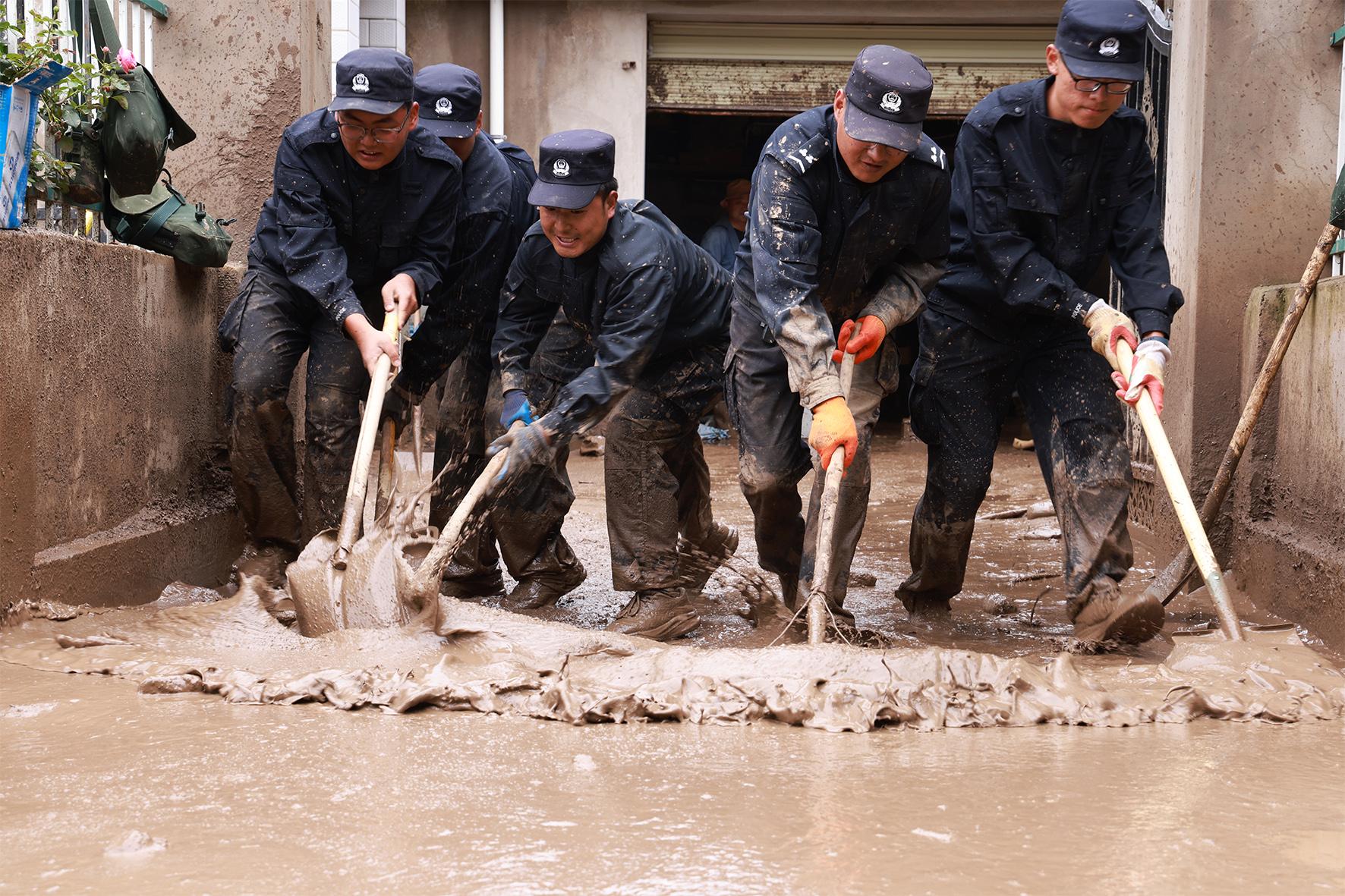 8月8日,甘肅省蘭州市公安局民警在甘肅省蘭州市榆中縣城關(guān)鎮(zhèn)興隆山村清理淤泥。8月7日至8日,榆中縣等地遭遇連續(xù)強降雨,引發(fā)山洪災(zāi)害,榆中縣城關(guān)鎮(zhèn)、馬坡鄉(xiāng)、小康營鄉(xiāng)、夏官營鎮(zhèn)等多個鄉(xiāng)鎮(zhèn)受災(zāi)。
