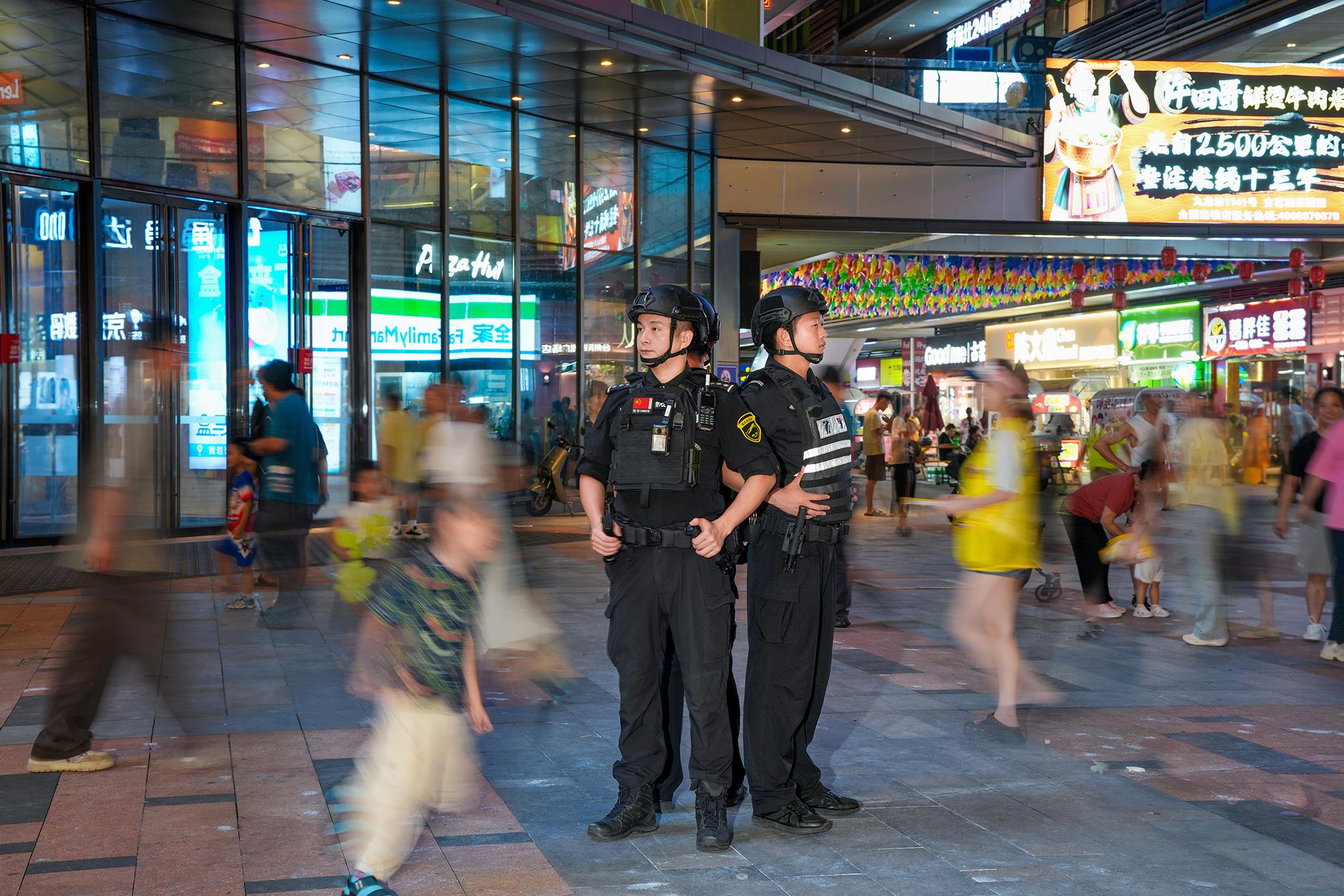圖為8月12日夜,巡特警大隊(duì)民警在商業(yè)廣場(chǎng)巡邏執(zhí)勤。